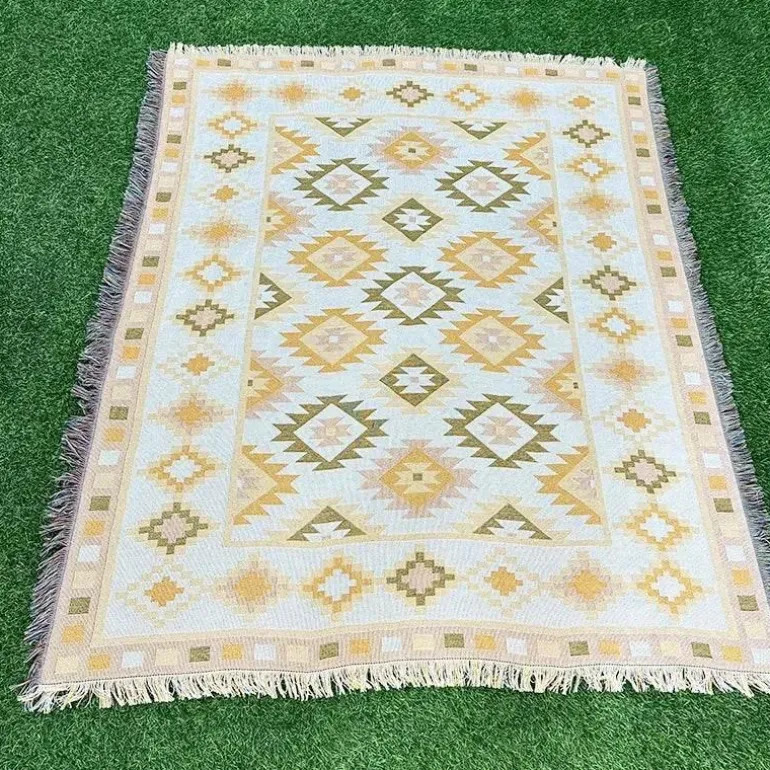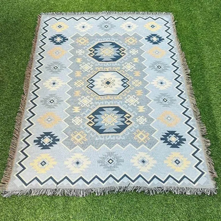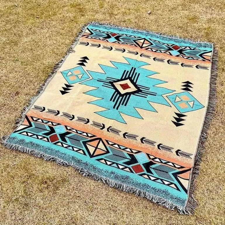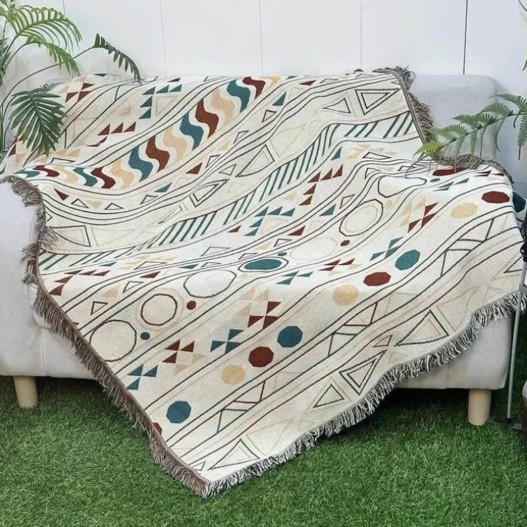 Mit seinem auffälligen geometrischen Muster wertet diese Decke mühelos die Atmosphäre jeder Umgebung auf – egal, ob Sie ein Picknick im Park genießen, auf einer Abenteuerreise sind oder es sich zu Hause gemütlich machen. Ihr leichtes und tragbares Design macht sie zum idealen Begleiter für Frühlings- und Herbstausflüge und bietet überall Wärme und einen Hauch von Eleganz.