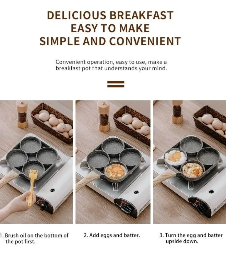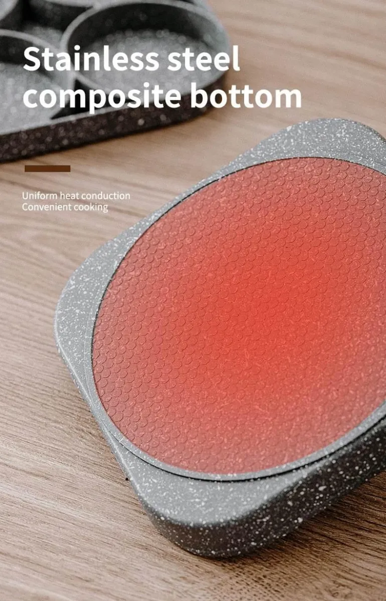 Mit vier Fächern eignet sich diese multifunktionale Pfanne perfekt für die Zubereitung von Omeletts, Burgern und mehr und ermöglicht Ihnen die schnelle und effiziente Zubereitung köstlicher Mahlzeiten.