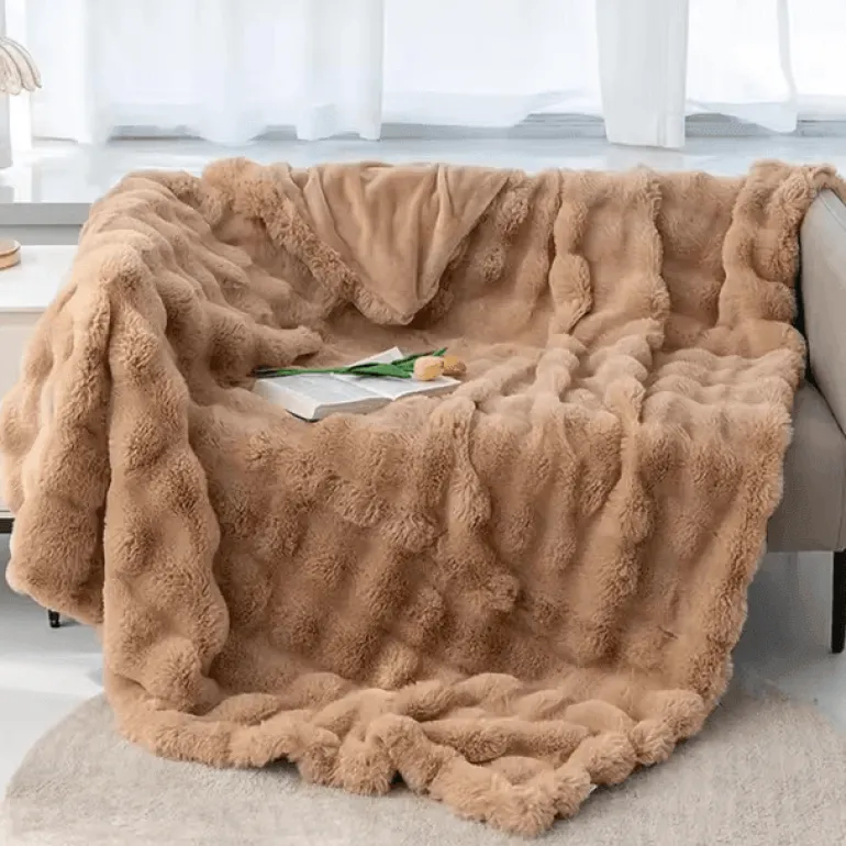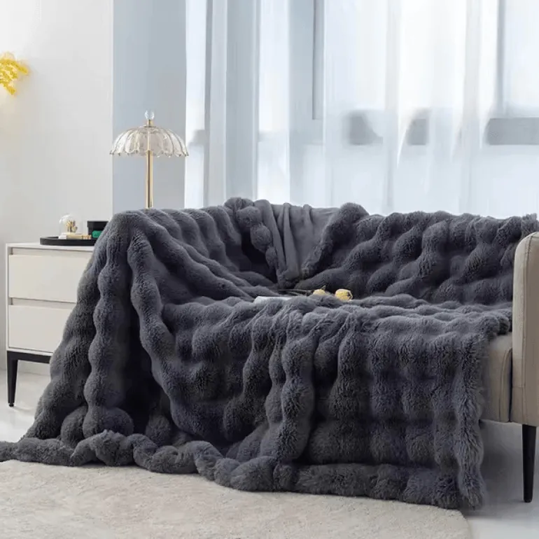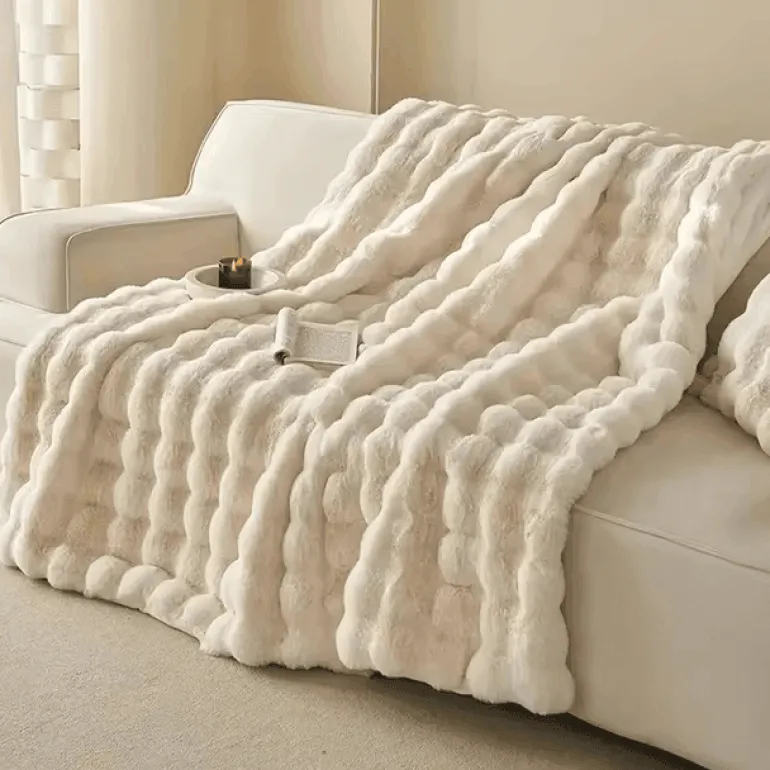 Entdecken Sie die Bubble Blanket, eine einladende Decke für Komfort und Entspannung. Diese Decke aus ultraweichem Kaninchenflanell besticht durch ihre besondere Noppenstruktur, die sowohl ihre Weichheit als auch ihre Optik unterstreicht.