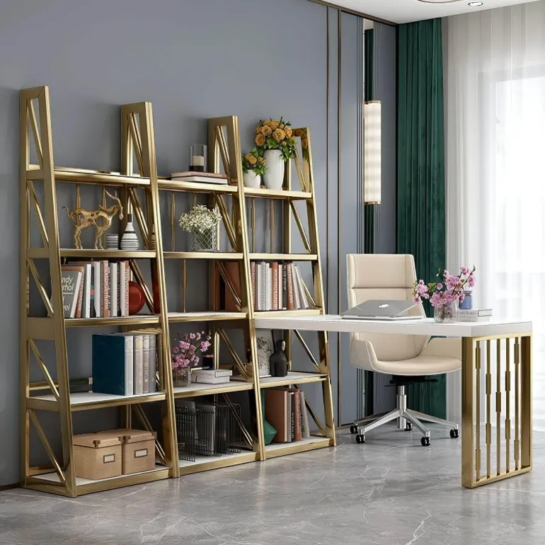 Das Benedetto Bücherregal wurde durchdacht und für den praktischen Einsatz konzipiert. Es bietet großzügigen Stauraum für Ihre Büchersammlung oder Dekorationsgegenstände und ist die perfekte Leinwand für die Präsentation Ihrer wertvollen Besitztümer. Die luxuriöse Goldoberfläche verleiht Ihrem Arbeitsplatz einen besonderen Charme und macht es zur idealen Wahl für alle, die ihre Büroeinrichtung aufwerten möchten.