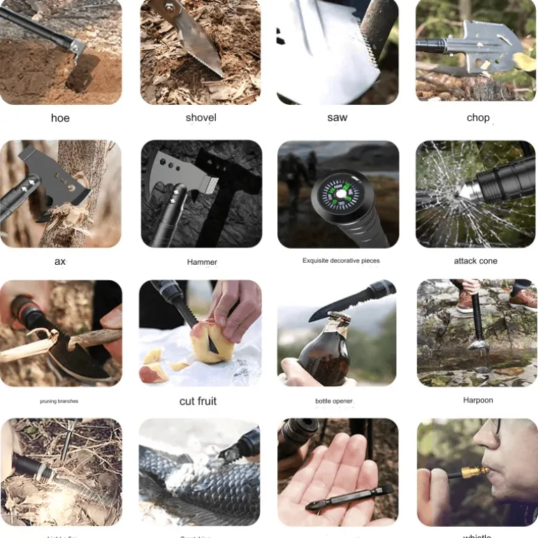 Das Set enthält ein All-in-One-Camping-Werkzeugset – perfekt für alle, die gerne auf alle Herausforderungen der Natur vorbereitet sind. Mit diesem Werkzeugset können Sie die Natur selbstbewusst erkunden.