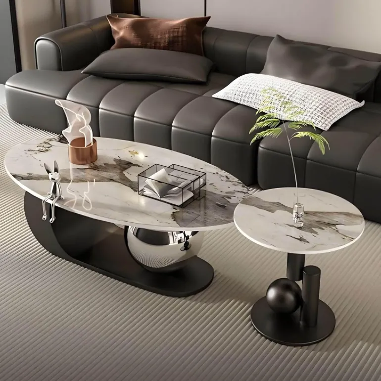 Der schimmernde Silberfuß unterstreicht nicht nur die Optik des Tisches, sondern unterstreicht auch seinen innovativen Designansatz. Der elegant geschwungene Sockel spiegelt fließenden künstlerischen Ausdruck wider, sorgt für Stabilität und Balance und macht ihn zu einem praktischen Mittelpunkt Ihres Wohnraums. Dieser Couchtisch lädt zu entspannten Momenten und anregenden Gesprächen ein und schafft eine einladende Atmosphäre für Sie und Ihre Gäste.