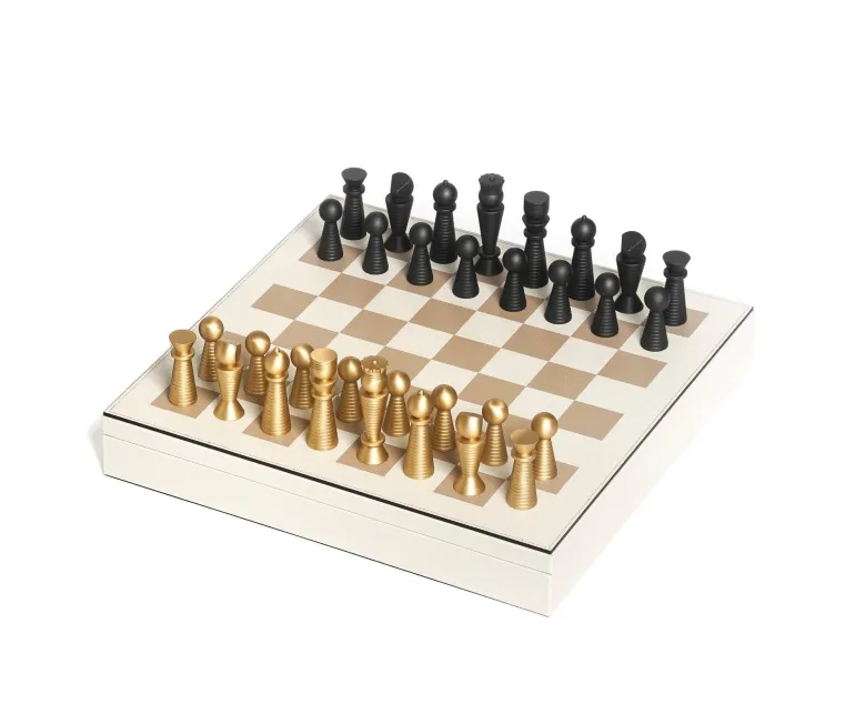 - An interior storage tray for the pearled checkers and black and brass-finished chess pieces