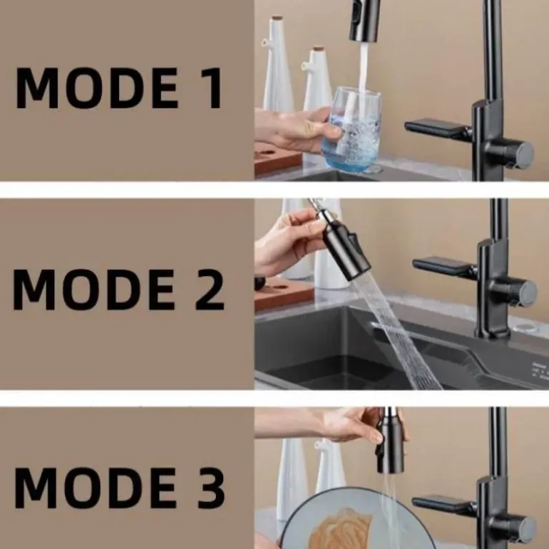 Verschönern Sie Ihr Küchenerlebnis mit dieser stilvollen und praktischen digitalen Küchenarmatur mit fortschrittlichem Temperatursensor. Diese Armatur vereint moderne Technologie mit raffinierter Ästhetik und verfügt über eine digitale Anzeige, die die Wassertemperatur präzise anzeigt. So erreichen Sie mühelos die perfekte Temperatur zum Kochen und Reinigen. Der elegante Wasserfallstrahl strahlt nicht nur Eleganz aus, sondern verbessert auch die Funktionalität Ihrer Spüle.