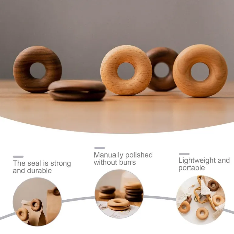 Genießen Sie die Funktionalität und den Charme unserer Donut-Verschlussklammern aus Naturholz – eine umweltfreundliche, gesunde und ungiftige Alternative. Diese Klammern bestehen vollständig aus massiven, organischen Materialien ohne Füllstoffe oder Kunststoff und sind daher langlebig, ohne Bruch oder Verblassen, wie es bei herkömmlichen Kunststoffklammern üblich ist. Sie eignen sich perfekt zum Verschließen verschiedener Lebensmittelbeutel, darunter Chips, Brot, Kaffeebeutel und andere Snacks, und halten Ihre Lebensmittel länger frisch. Dank ihres einzigartigen Designs eignen sie sich zudem als dekoratives Element in Ihrer Küche.