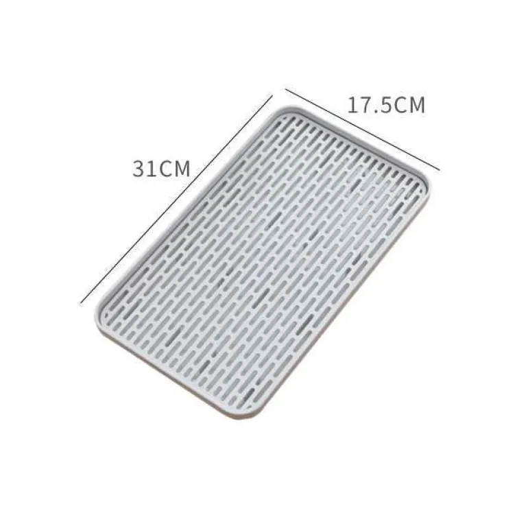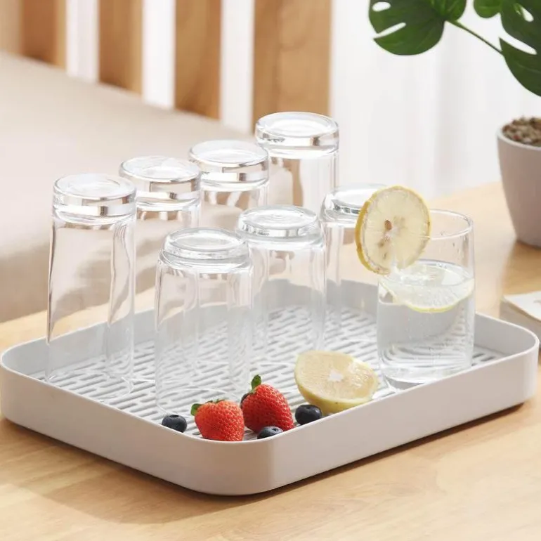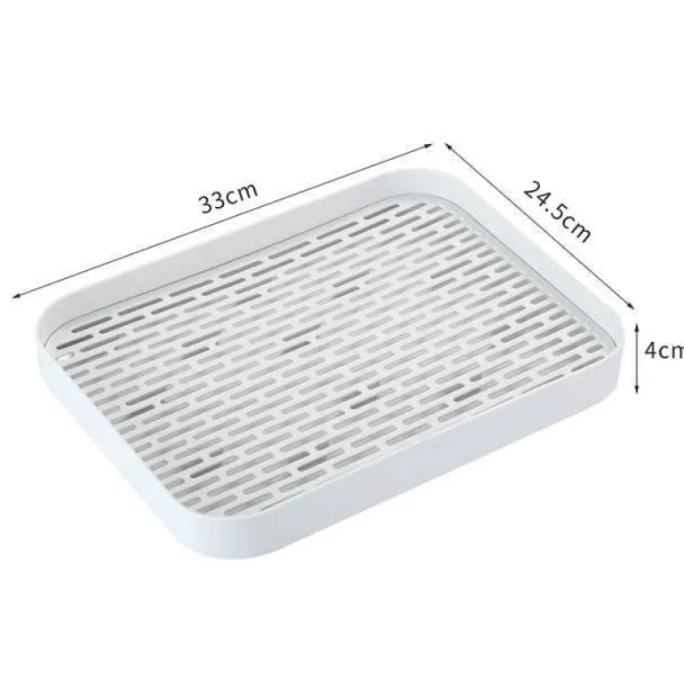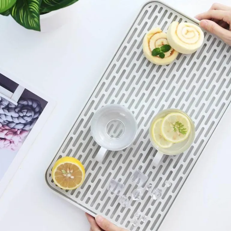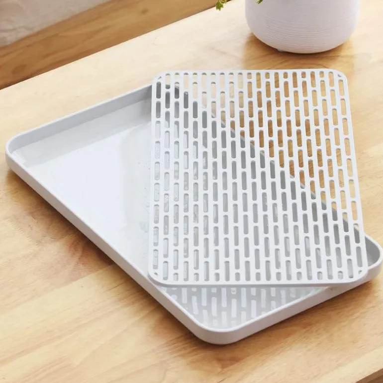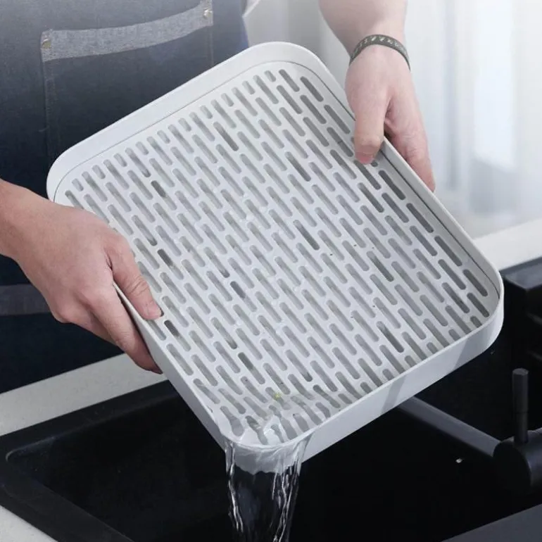 Dank des Hohlgitterdesigns liegt die obere Schicht erhöht über der wasserauffangenden unteren Schicht. Diese durchdachte Konstruktion fördert nicht nur den Wasserablauf, sondern sorgt auch für Ordnung und Ordnung in Ihrer Küche. Dieses vielseitig einsetzbare Abtropftablett dient verschiedenen Zwecken – zum Abtropfen von Gemüse und Obst, zum Abtrocknen von Geschirr oder als stilvolles Teetablett.
