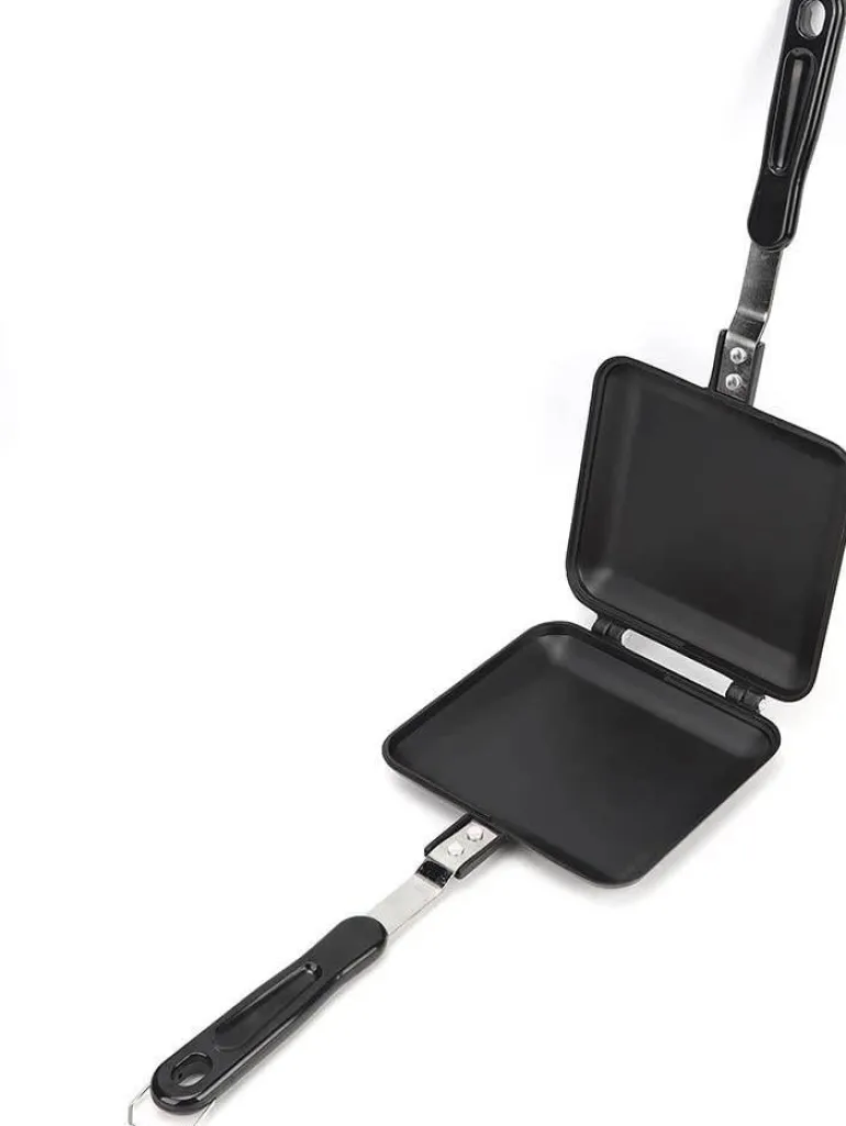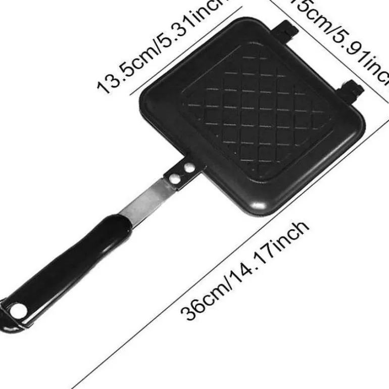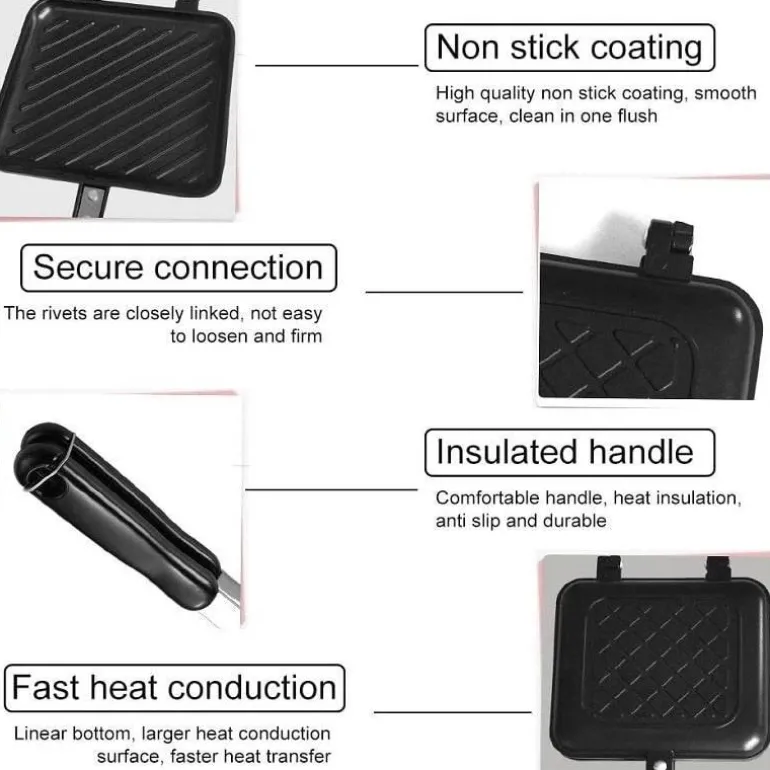 Kreieren Sie köstliche Sandwiches zu Hause mit der doppelseitigen Antihaft-Sandwichmaker-Pfanne. Diese vielseitige Grillplatte ist besonders praktisch und verfügt über eine zuverlässige Antihaftbeschichtung, mit der Sie Ihre Lieblingssandwiches mühelos und ohne viel Aufwand zubereiten können. Die leichte Aluminiumkonstruktion sorgt für eine gleichmäßige Wärmeverteilung und macht das Kochen effizient und angenehm. Die Reinigung ist kinderleicht, da die Pfanne spülmaschinenfest ist. So können Sie Ihre Sandwiches genießen und sparen Zeit beim Aufräumen.