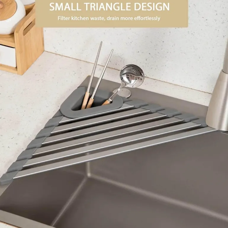 Wie schneidet dieses Produkt im Vergleich zu anderen ab? Im Gegensatz zu herkömmlichen Abtropfgestellen maximiert das dreieckige Design den Platz in der Spüle und verleiht gleichzeitig eine ästhetische Note. Die Kombination aus Silikon und Aluminium bietet im Vergleich zu Vollkunststoffalternativen eine überlegene Haltbarkeit.