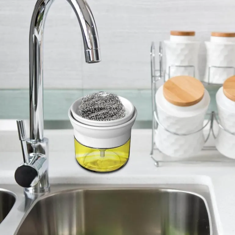 Im Paket enthalten ist ein Easy Press-Spülmittelspender, der Ihre Geschirrspülroutine erleichtert und Ihre Arbeitsplatte sauber hält.