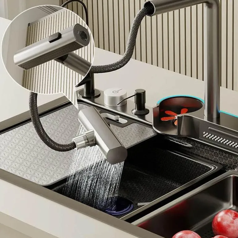 – **Wie schneidet dieses Produkt im Vergleich zu anderen ab?** Im Gegensatz zu herkömmlichen Spülbecken verfügt dieses Modell über erweiterte Funktionen wie einen Wasserfallauslauf und eine integrierte intelligente Waschmaschine und fügt sich gleichzeitig nahtlos in moderne Küchenräume ein.
