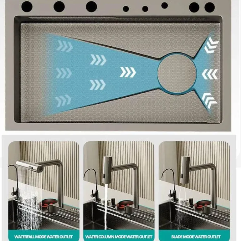 Entdecken Sie die innovative Honeycomb Digital Nano Integrated Edelstahl-Wasserfallspüle, die sowohl die Funktionalität als auch die Ästhetik Ihrer Küche verbessert. Diese moderne Spüle verfügt über einen markanten Wasserfallauslauf, der ein faszinierendes optisches Element darstellt und gleichzeitig einen effizienten Wasserablauf gewährleistet. Die hochmoderne Nanobeschichtung erhöht die Haltbarkeit und macht die Spüle kratz- und fleckenbeständig, sodass sie auch bei täglichem Gebrauch ihr elegantes Aussehen behält.