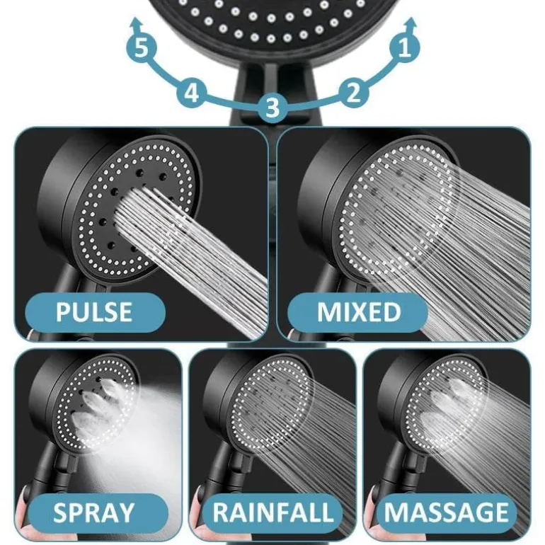 Der Duschkopf verfügt über fünf verschiedene Modi: Puls, Regen, Gemischt, Massage und Brause. Jede Einstellung sorgt für ein einzigartiges Duscherlebnis und einen feinen, dichten und gleichmäßigen Wasserstrahl, der sich sanft auf der Haut anfühlt.