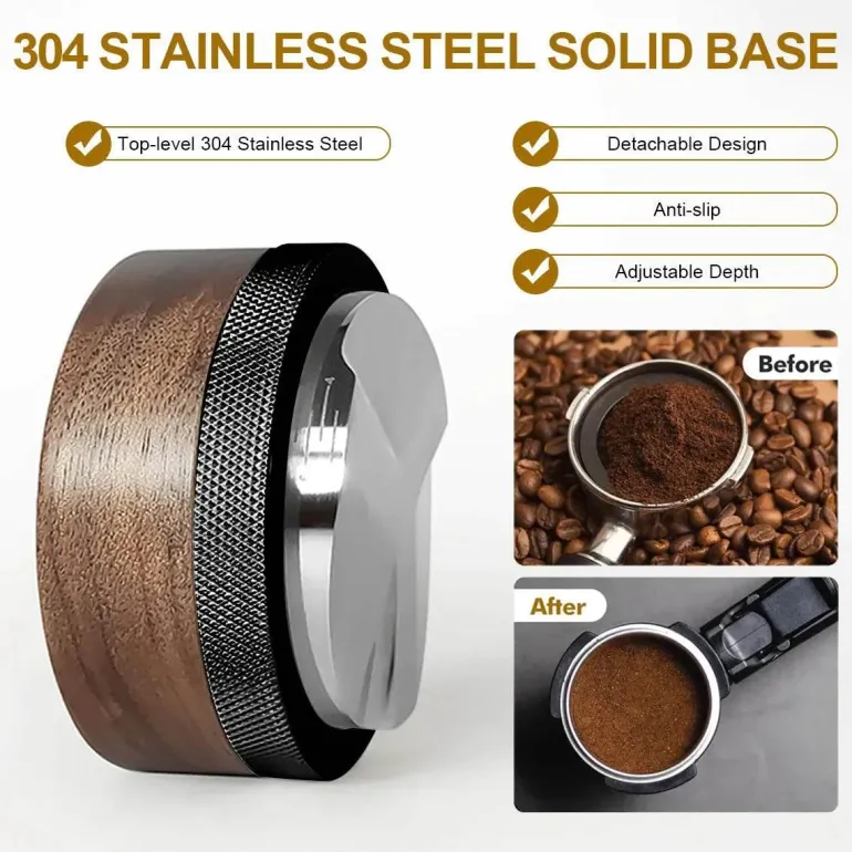 Entdecken Sie das verstellbare Espresso-Verteilerwerkzeug und den Holzstampfer. Sie sind fachmännisch aus hochwertigem Holz gefertigt und in den Größen 51 mm, 53 mm und 58 mm erhältlich. Dieses unverzichtbare Werkzeug ist für Kaffeeliebhaber gedacht, die Wert auf Präzision und Konsistenz beim Brühvorgang legen.