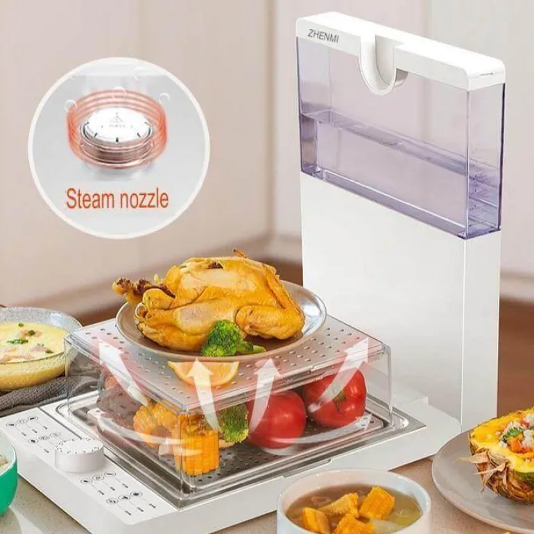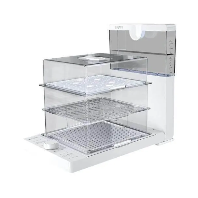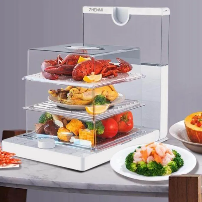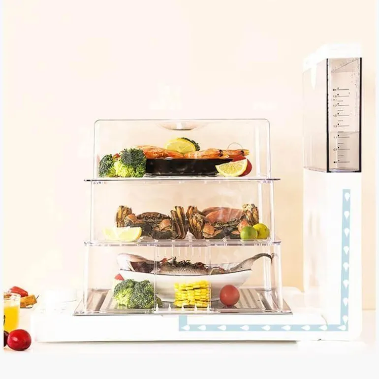 Die Dampffunktion ist schnell und einfach, und Sie können den Timer für die Hochtemperatur-Sterilisation auf bis zu 60 Minuten einstellen. Dank des großzügigen Wassertanks mit 1,7 l Fassungsvermögen müssen Sie sich während des Dampfgarens keine Sorgen mehr machen, dass Ihnen das Wasser ausgeht. Das dreischichtige Design ermöglicht vielseitiges Kochen: Verwenden Sie eine Schicht für Einzelportionen, zwei Schichten für gleichzeitiges Dämpfen oder alle drei Schichten für große Gerichte – mit einem beeindruckenden Gesamtvolumen von 10,8 l. Die sichtbare Dampfbox macht das ständige Öffnen und Schließen des Deckels überflüssig und ermöglicht so eine einfache Überwachung des Garvorgangs.