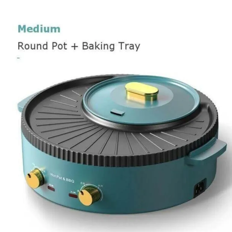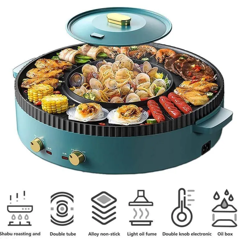 Erleben Sie die Vielseitigkeit unseres elektrischen rauchfreien BBQ-Grills – perfekt für die koreanische Küche. Dieses multifunktionale Gerät verfügt über eine Grillplatte und einen Hot Pot, beide mit unabhängiger Stromversorgung und präziser Temperaturregelung. Dank des Doppelfunktionsdesigns können Sie sowohl grillen als auch im Hot Pot speisen – ein idealer Mittelpunkt für gemütliche Stunden. Die geräumige Backplatte bietet Platz für verschiedene Zutaten wie Fleisch, Gemüse und Meeresfrüchte, während der unterteilte Hot Pot die gleichzeitige Zubereitung zweier verschiedener Geschmacksrichtungen ermöglicht.