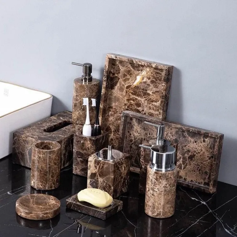 Transform your bathroom into a sanctuary of elegance with the Emperador Dark Marble Bathroom Collection. This sophisticated set features a rich brown marble design that exudes timeless charm. Each piece is crafted with meticulous attention to detail, ensuring that the collection not only enhances the aesthetics of your space but also meets everyday functional needs.