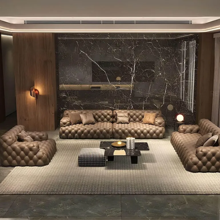 Introducing the Éric Luxury Sofa—a perfect blend of elegance and comfort for your living room. With its Italian-inspired design, this sofa is tailored to enhance the sophistication of a variety of interiors, from light luxury villas to minimalist spaces featuring warm brown and grey tones.