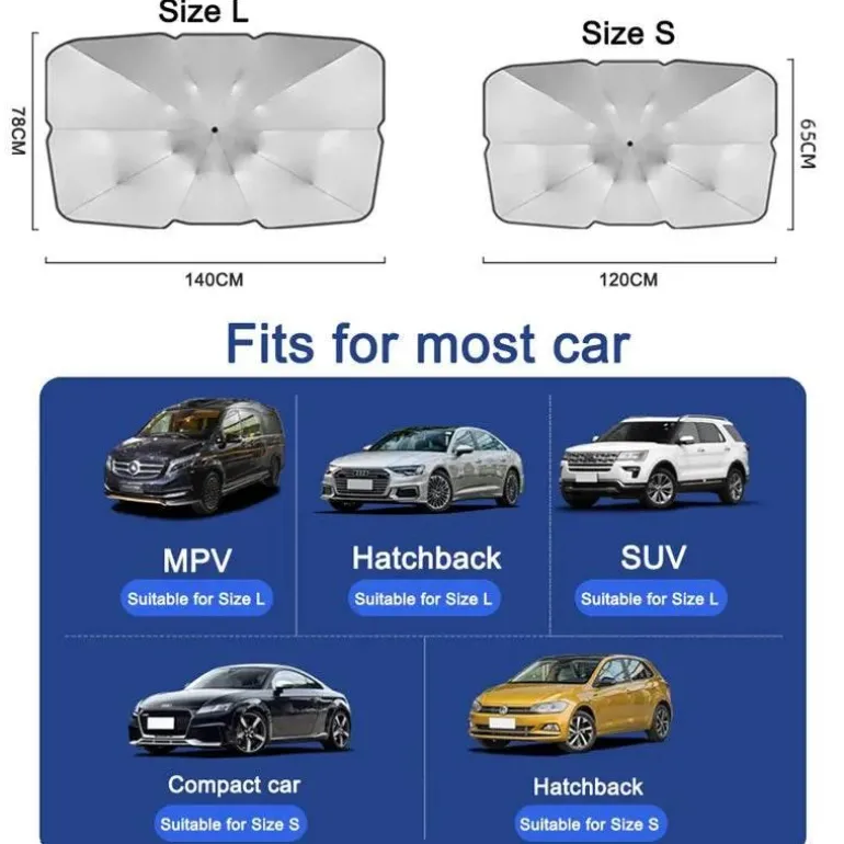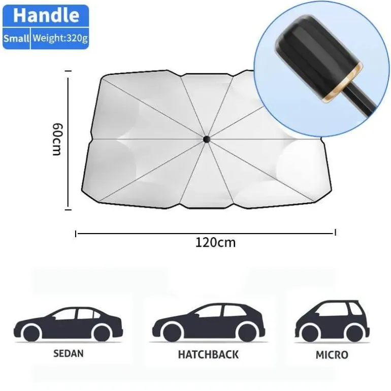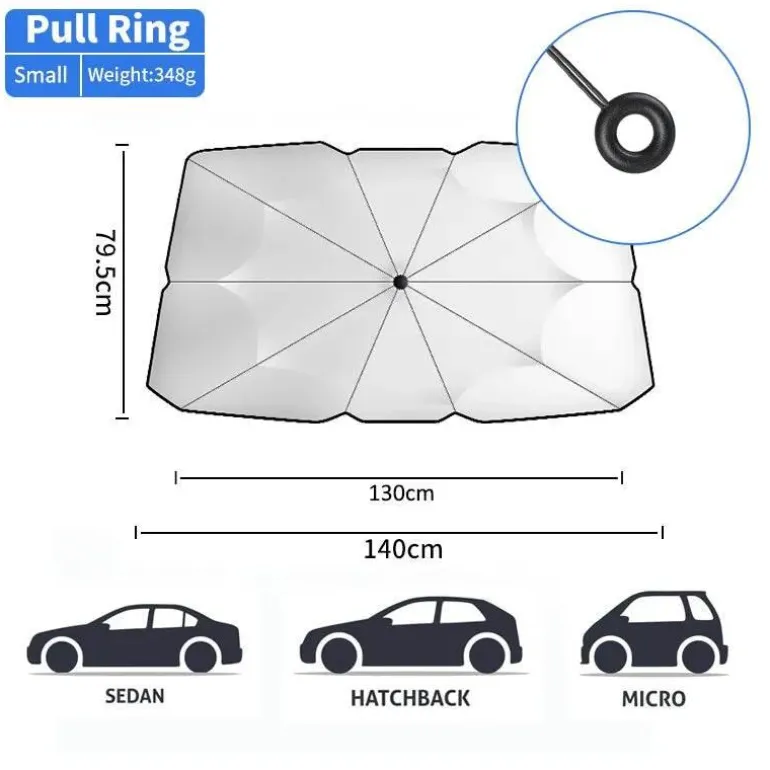 Der Regenschirm ist benutzerfreundlich gestaltet, lässt sich mühelos entfalten und bei Nichtgebrauch bequem verstauen. Er ist ideal für Fahrer, die den Innenraum ihres Autos pflegen und an heißen Tagen für mehr Komfort sorgen möchten. Dank seines kompakten Designs nimmt er wenig Platz ein und ist sowohl effizient als auch praktisch.