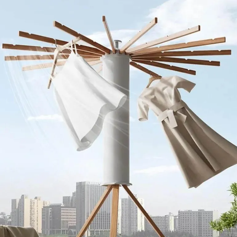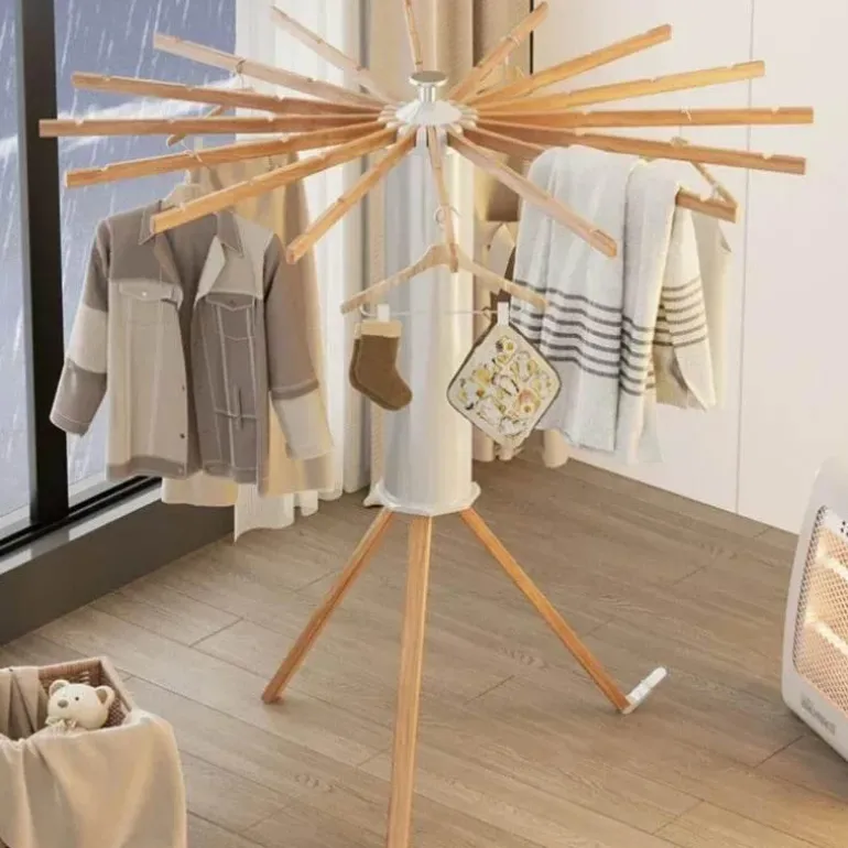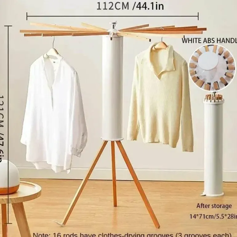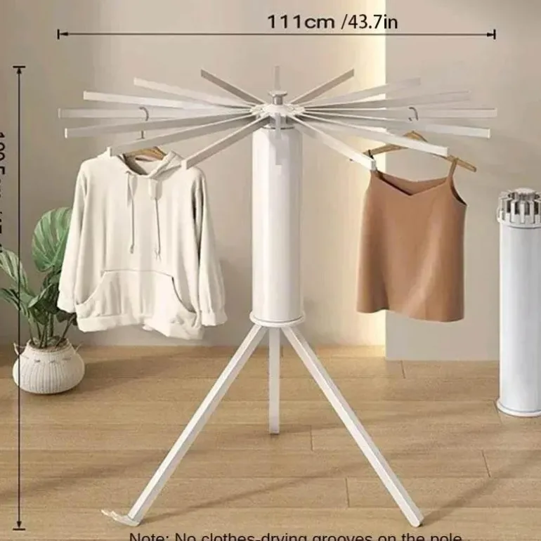Der Wäscheständer ist praktisch und lässt sich einfach zusammenklappen. Dank seines skalierbaren Designs lassen sich Halterung und Trockenstangen zu einem kompakten ABS-Zylinder zusammenfalten und so problemlos in jeder Ecke Ihres Zuhauses verstauen. Vollständig ausgeklappt deckt er eine Fläche von 1,2 Quadratmetern ab, zusammengeklappt beträgt er nur 0,14 Quadratmeter.