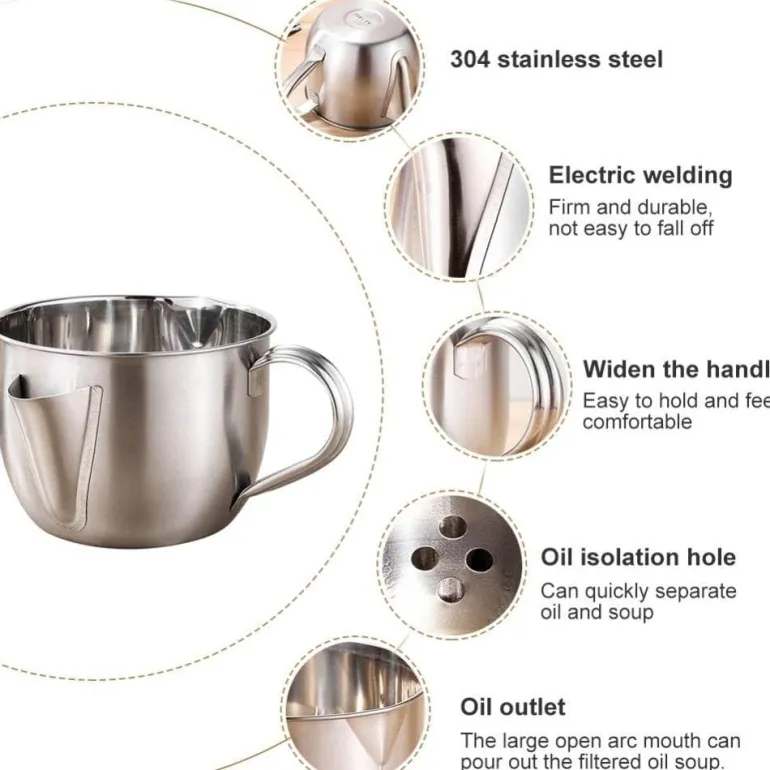 Edelstahl 304, hochglanzpoliert, dick und langlebig, leicht zu reinigen. Der verbreiterte Griff liegt gut in der Hand, ist angenehm zu handhaben und die elektrische Schweißnaht am Ölauslass ist fest und langlebig und fällt nicht leicht ab.