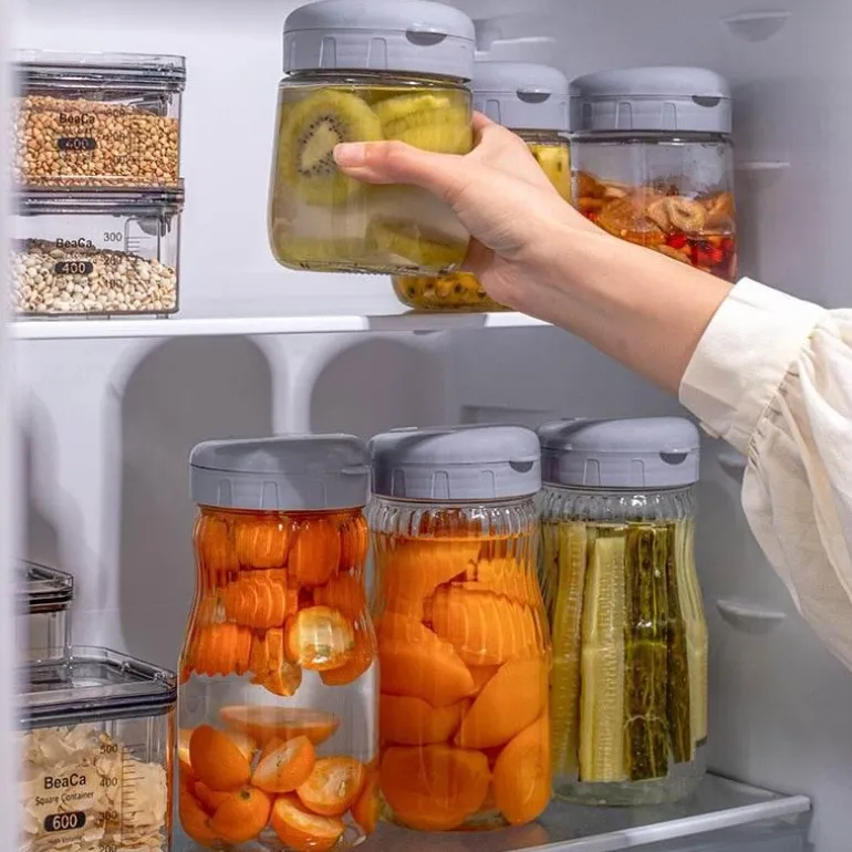 Dieses vielseitige Glas aus transparentem Glas bietet Ihnen einen guten Blick auf den Inhalt und eignet sich daher zur Aufbewahrung von trockenen und feuchten Lebensmitteln in Ihrer Speisekammer oder Ihrem Kühlschrank. Erhältlich in kleinen und großen Größen, finden Sie das perfekte Glas für Ihre individuellen Aufbewahrungsbedürfnisse.