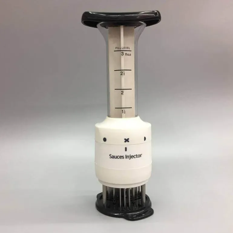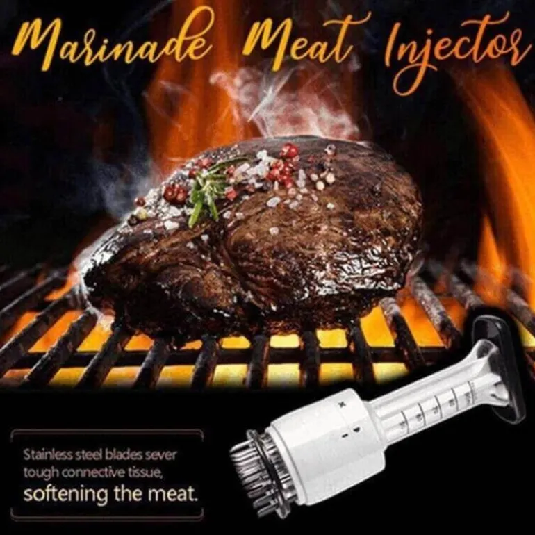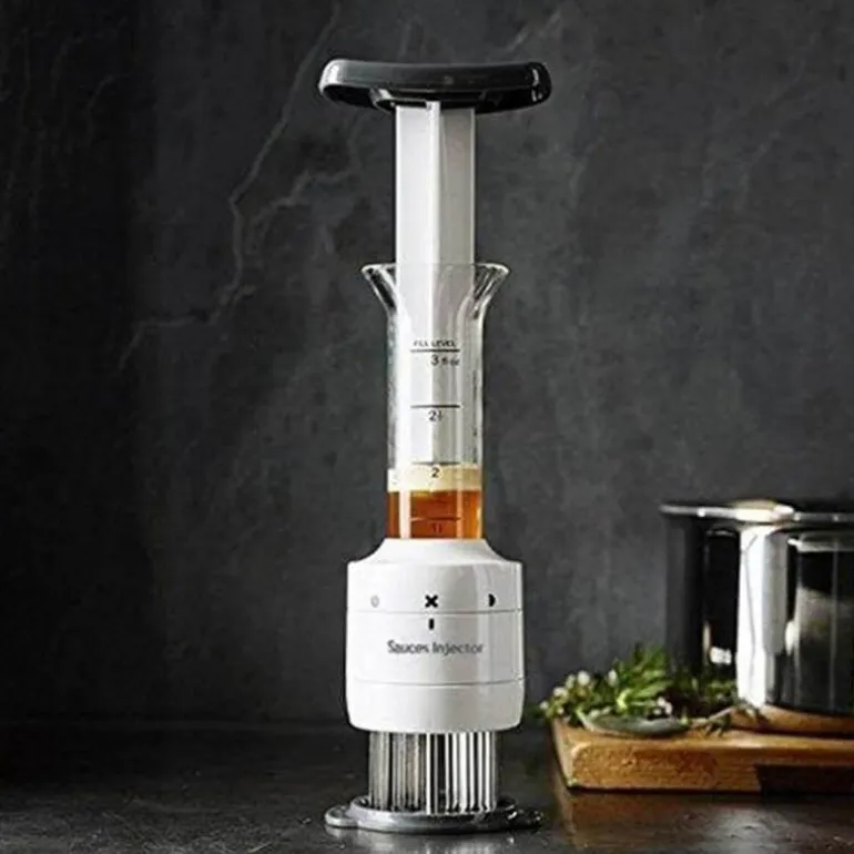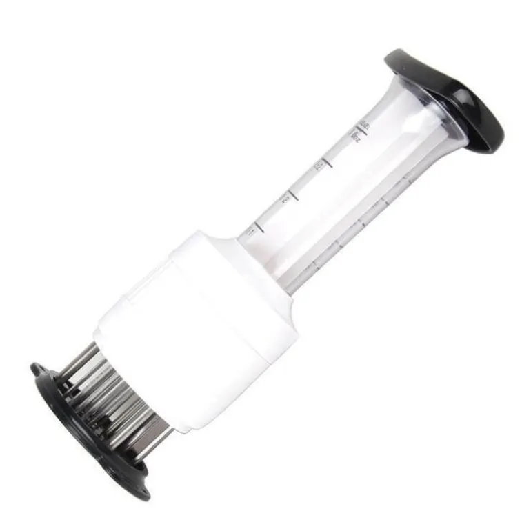 Verbessern Sie Ihr kulinarisches Erlebnis mit unserem Filet-Injektor zum Marinieren von BBQ-Gerichten. Dieses innovative Werkzeug verfügt über einen integrierten Kolben, der die Marinade über drei nadelartige Applikatoren effizient in Ihr Fleisch abgibt. So sorgen die geschmacksverstärkenden Zutaten dafür, dass das Innere Ihres Grillguts schnell durchdringt.