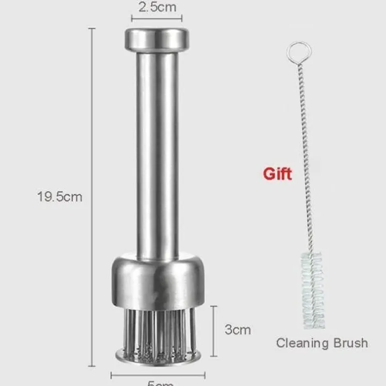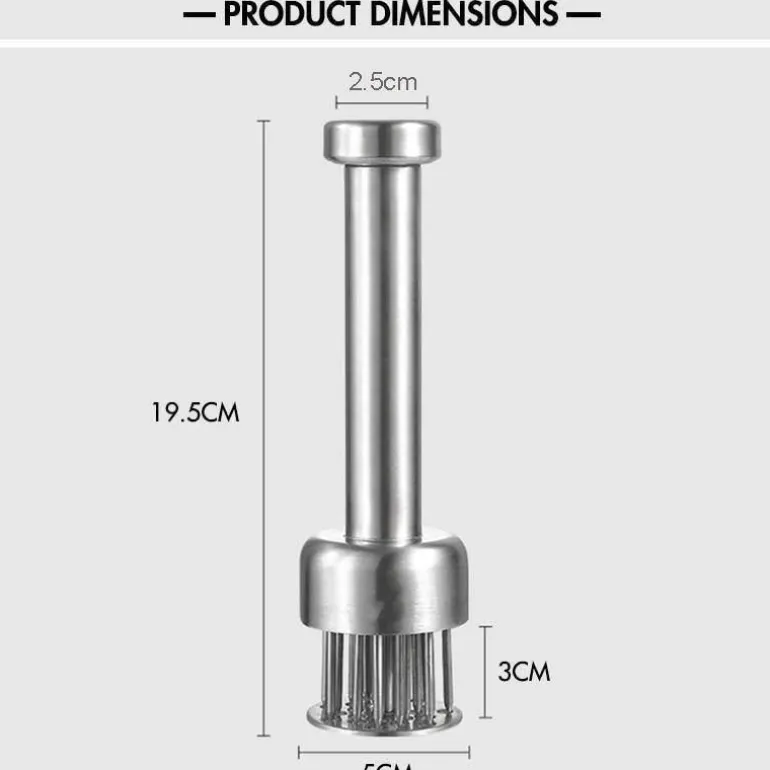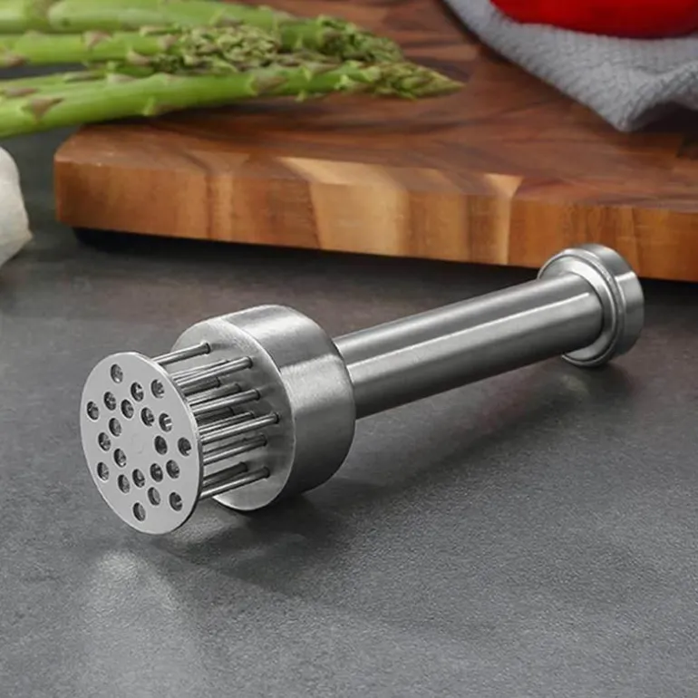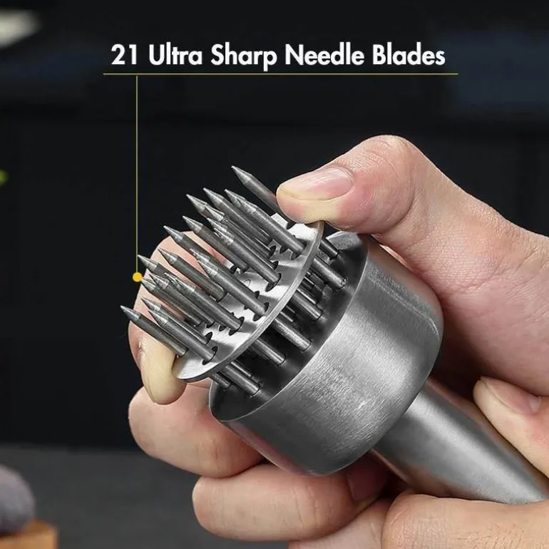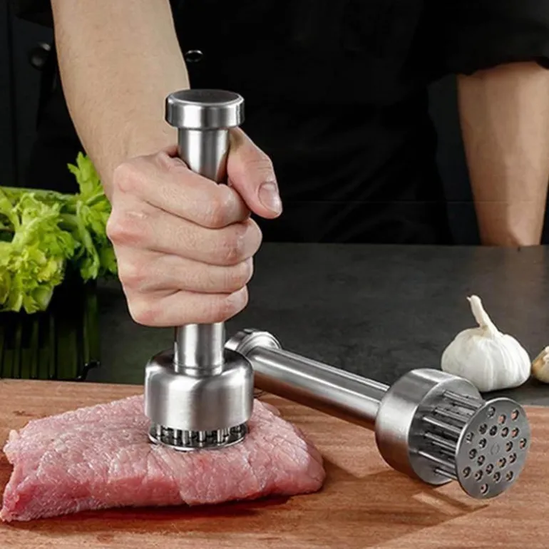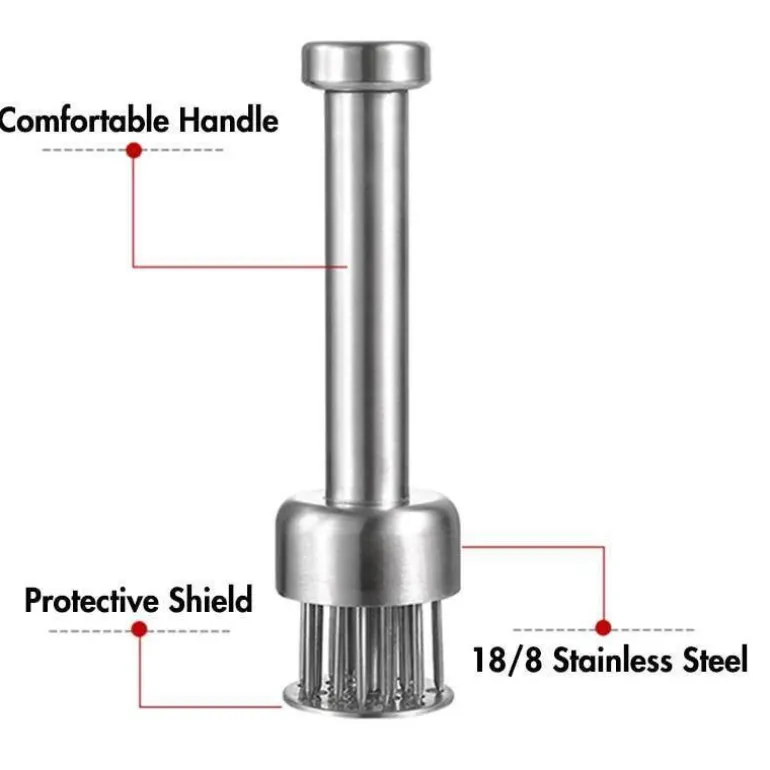 Der Fleischklopfer aus Edelstahl ist ein unverzichtbares Küchenwerkzeug für ein noch besseres Kocherlebnis. Mit seiner ultrascharfen Klinge eignet sich dieser Fleischklopfer ideal zum effektiven Zerkleinern von Fasern in verschiedenen Fleischsorten, darunter Wild, Schwein, Rind, Kalb, Geflügel und sogar empfindliche Fleischsorten wie Fisch. Durch das Einstechen winziger Schlitze im Fleisch verkürzt sich die Garzeit um bis zu 40 %, während Form, Aussehen und Geschmack des Fleisches erhalten bleiben.