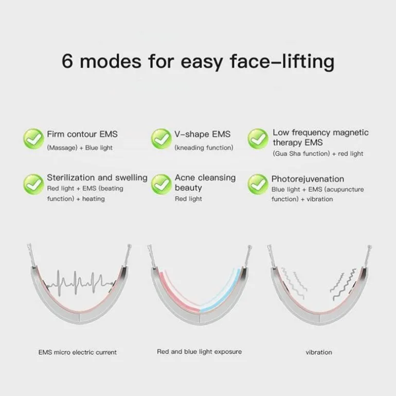 – Modi: Beinhaltet Konturstraffung, V-Formung, Niederfrequenz-Magnetfeldtherapie, Sterilisation und Schwellungsreduzierung, Akne-Reinigung und Photorejuvenation