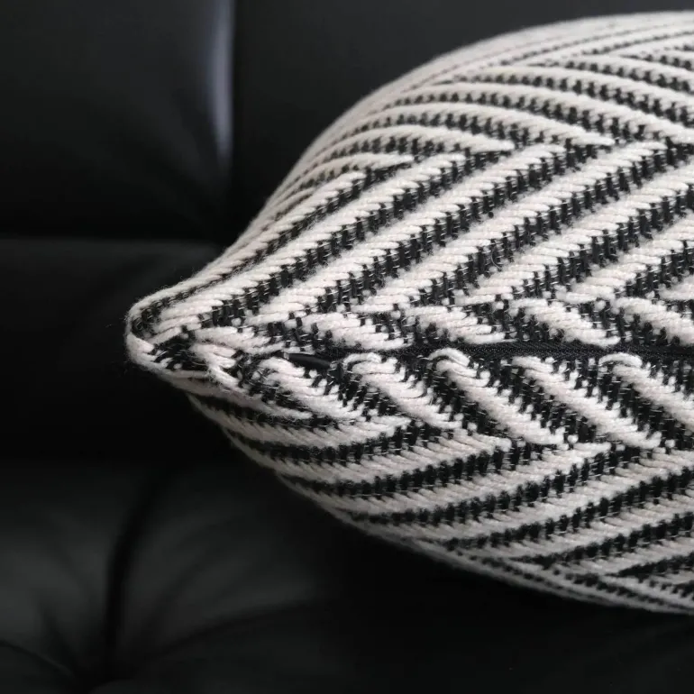Wir präsentieren unsere wunderschön gefertigten Kissenbezüge mit gewebtem Wollhäkelmuster in auffälligem Schwarz und Weiß – die ideale Wahl für Ihre Wohnkultur. Diese dekorativen Bezüge bestehen aus einer luxuriösen Polyester-Baumwollmischung und bestechen durch ihr faszinierendes geometrisches Muster, das modernes Flair mit klassischem Charme harmonisch verbindet.