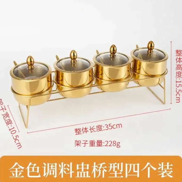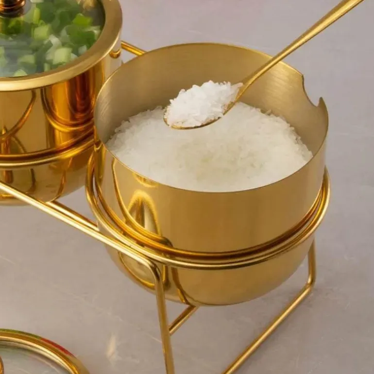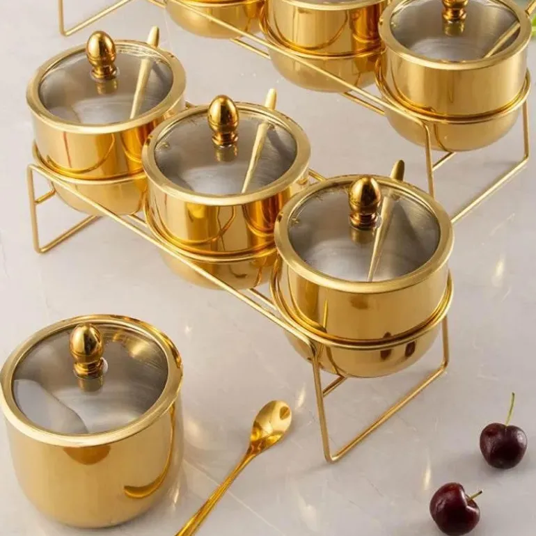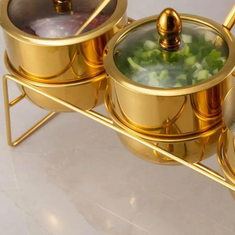 Jedes Glas fasst großzügige 270 ml und bietet somit ausreichend Platz für Ihre wichtigsten Kochzutaten. Das edle Goldfinish verleiht Ihrer Kücheneinrichtung eine edle Note, wertet sie optisch auf und passt zu vielen Stilen.