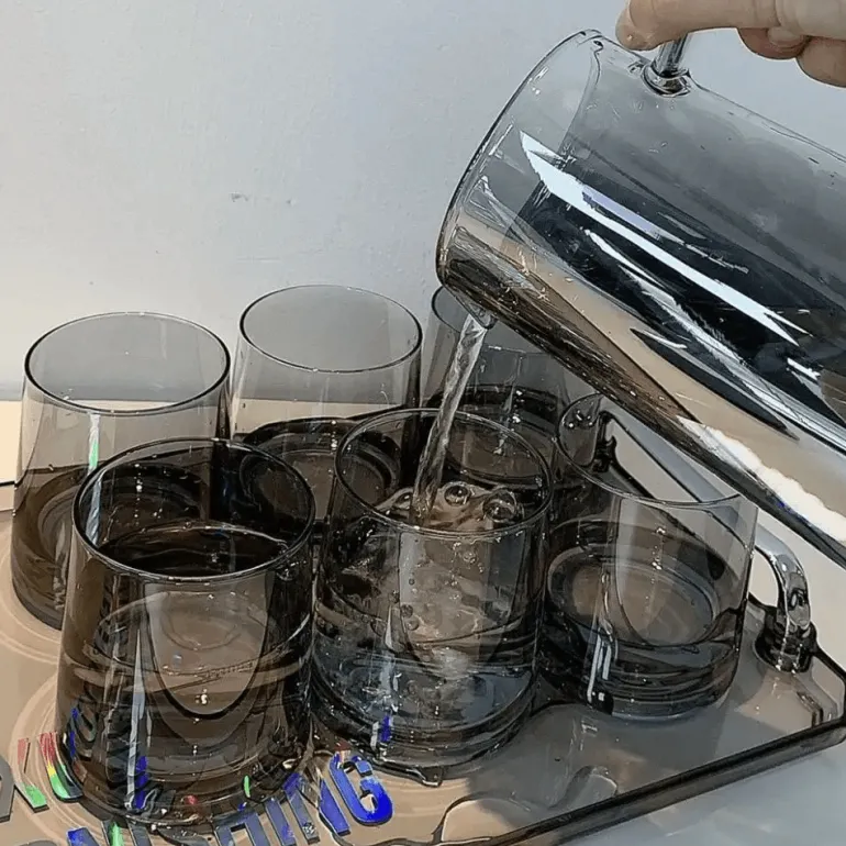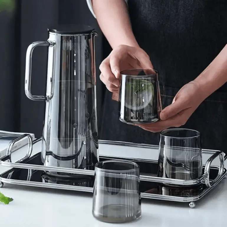 Wir präsentieren den Gray Glass Pitcher, einen großen Krug zum stilvollen Servieren von Wasser, Saft und anderen Getränken. Diese elegante und zugleich funktionale Ergänzung für Ihre Küche oder Ihren Essbereich ist aus hochwertigem Borosilikatglas gefertigt und bietet sowohl Langlebigkeit als auch eine anspruchsvolle Ästhetik.