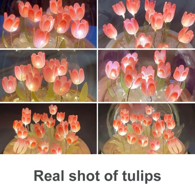 Jede Tulpe ist aufwendig gestaltet und sorgfältig gefärbt, sodass Sie sie frei an Ihren Wunschpositionen anordnen können. Die Lampe strahlt ein sanftes, warmes Licht aus, das die Atmosphäre Ihres Raumes unterstreicht und sie zur idealen Ergänzung für Schlafzimmer, Wohnzimmer oder gemütliche Leseecken macht.
