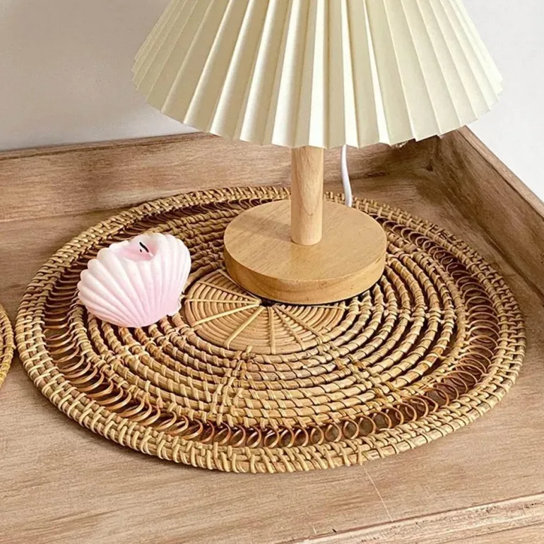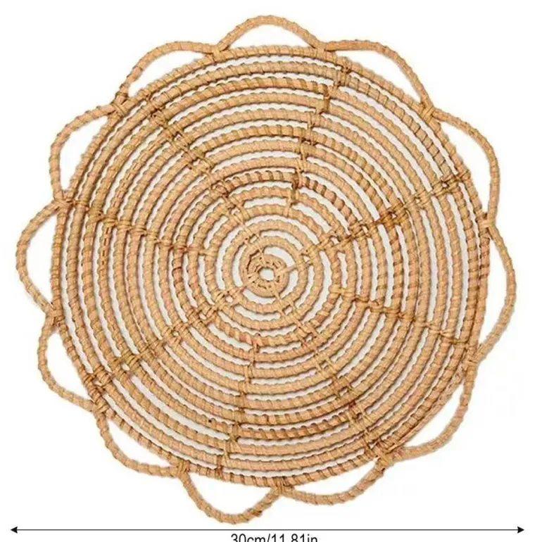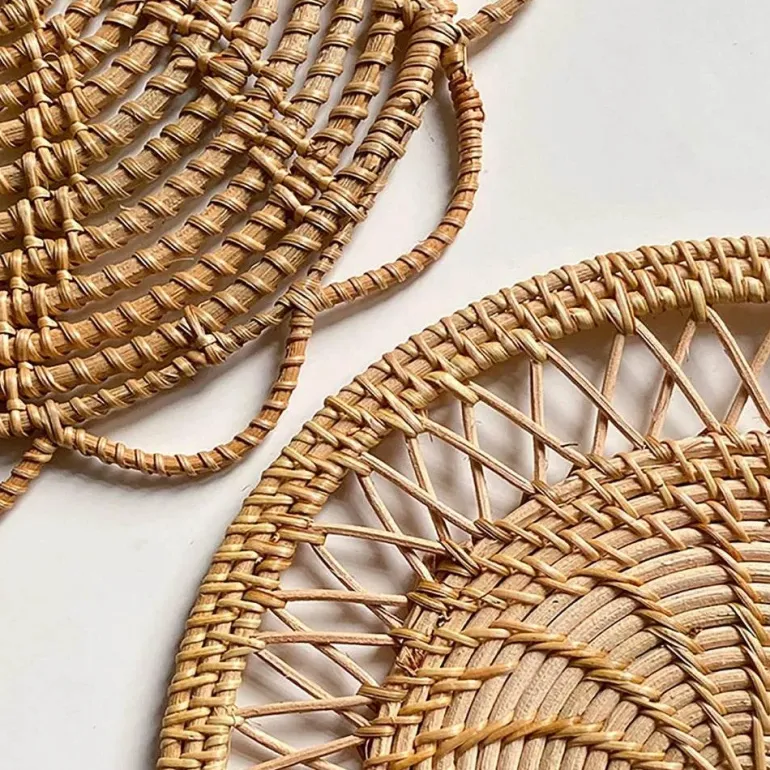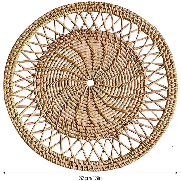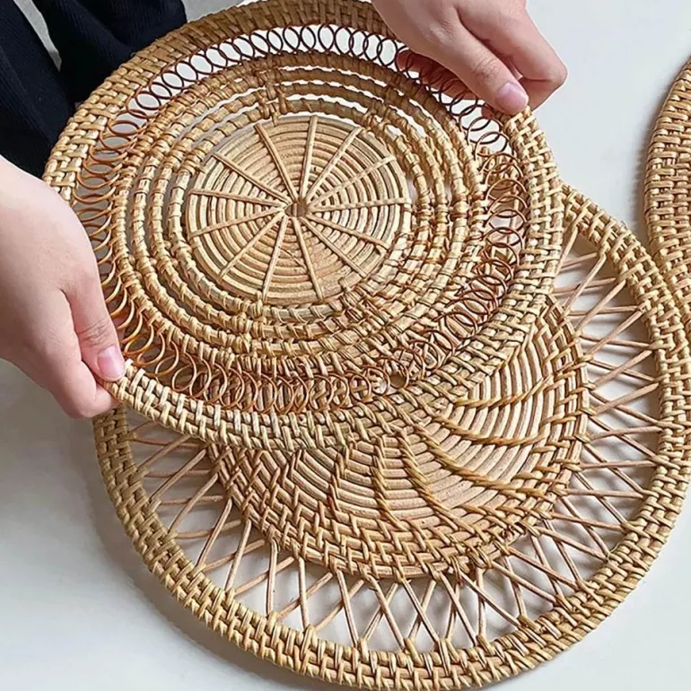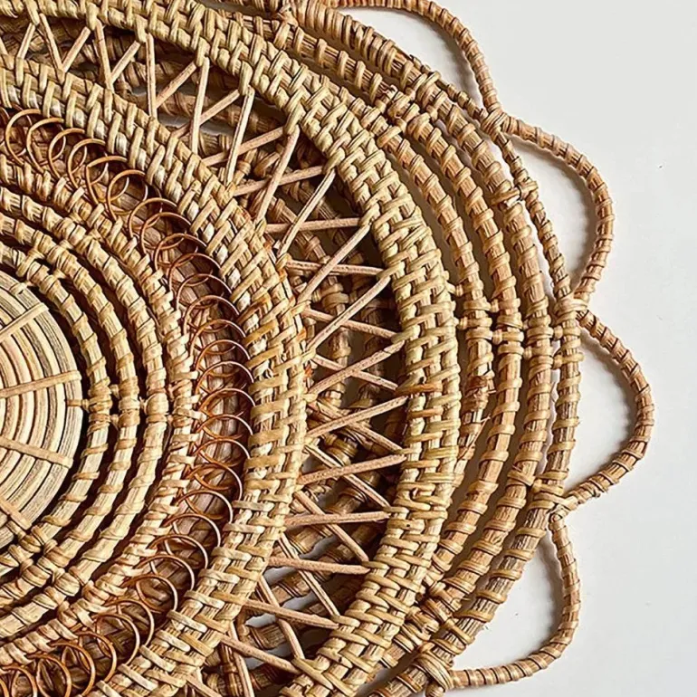 Dieses Set besteht aus drei einzigartigen Stücken mit Durchmessern von 25 cm, 30 cm und 33 cm. Jedes Stück zeugt von handwerklicher Handwerkskunst und unterstreicht die komplexen Flechttechniken und die erdigen Töne des Rattans. Diese Dekostücke verschönern nicht nur Ihre Wände, sondern erfüllen auch praktische Zwecke, beispielsweise als Tischsets oder Untersetzer für besondere Anlässe.