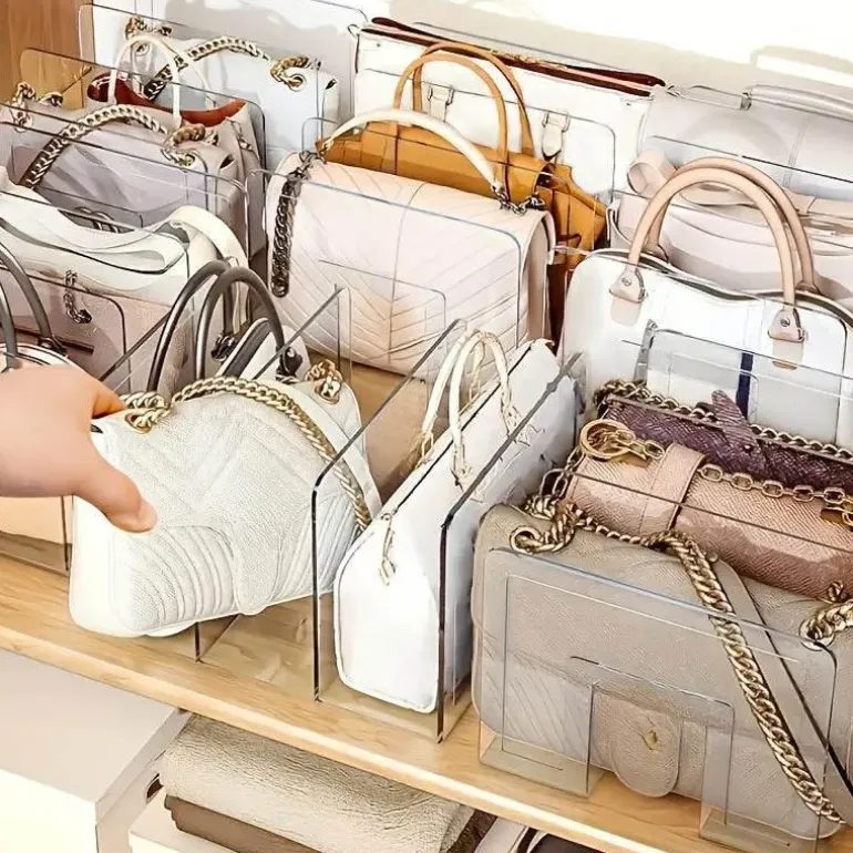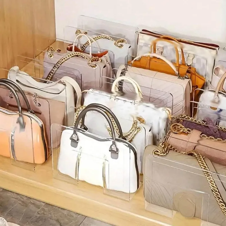 Verwandeln Sie Ihre Handtaschenaufbewahrung mit unserem eleganten Acrylregal, das Ihre Taschen mit klaren Linien und galerieartiger Ästhetik in Szene setzt. Dieser moderne Handtaschen-Organizer erhellt nicht nur Ihren Raum durch seine Klarheit und Helligkeit, sondern ermöglicht auch eine individuelle Präsentation, die Ihrem einzigartigen Stil entspricht. Das stapelbare und modulare Design sorgt für optimale Organisation Ihrer Sammlung und bietet mühelos Platz für verschiedene Handtaschengrößen.