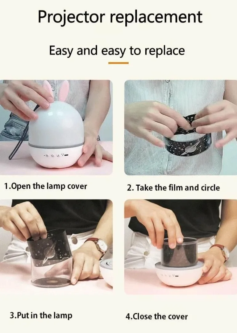 Verwandeln Sie das Zimmer Ihres Kindes mit diesem bezaubernden LED-Nachtlicht mit Hasenprojektor in ein magisches Wunderland. Diese bezaubernde Lampe projiziert einen faszinierenden Sternenhimmel an Wände, Decken oder Türen und bietet eine sanfte Einführung in die Wunder des Universums.