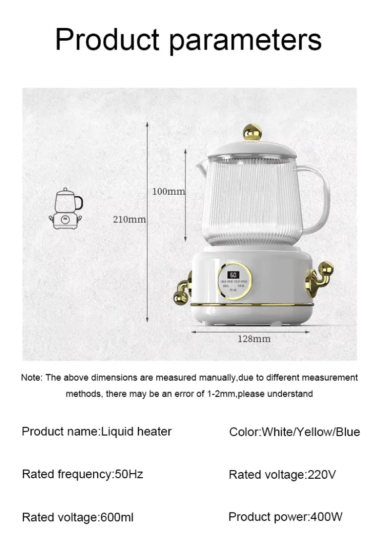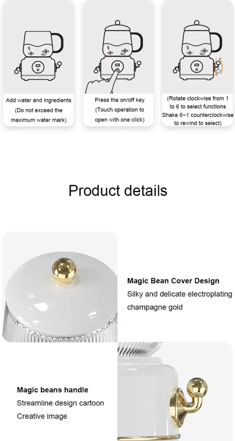Der Wasserkocher verfügt über eine intelligente Überlaufschutzfunktion, sodass Sie während des Kochens problemlos mehrere Aufgaben gleichzeitig erledigen können, ohne sich Sorgen um verschüttete Flüssigkeiten machen zu müssen. Dank des separaten Designs ist er kompakt und tragbar und lässt sich leicht überallhin mitnehmen. Er arbeitet leise und stört weder Ihre Arbeit noch Ihren Schlaf.