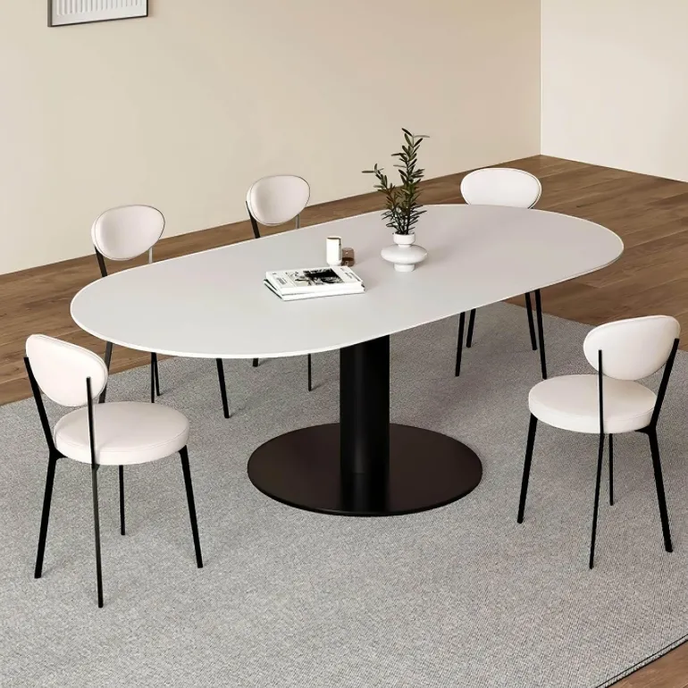 Wir präsentieren den Esstisch Hector – eine gelungene Mischung aus zeitgenössischer Eleganz und minimalistischem Design. Dieser markante ovale Esstisch besticht durch eine robuste Schieferplatte, die für ihre Robustheit und klassische Ästhetik bekannt ist. Die schlanken schwarzen Metallbeine unterstreichen das stromlinienförmige Profil des Tisches und verleihen ihm einen modernen Touch, der seine raffinierte Form perfekt ergänzt.