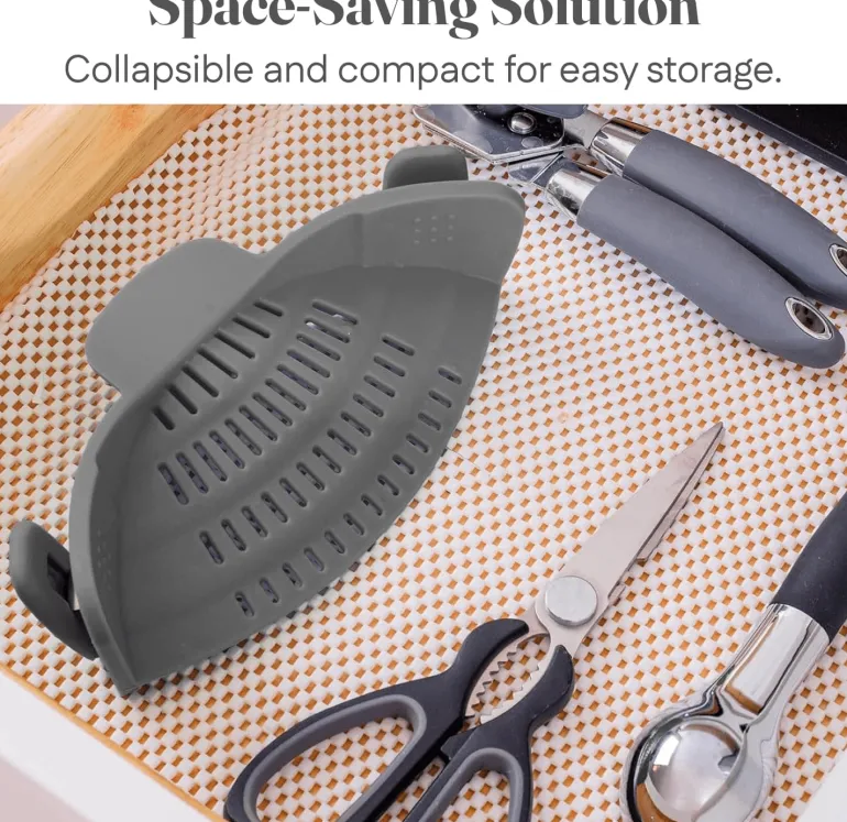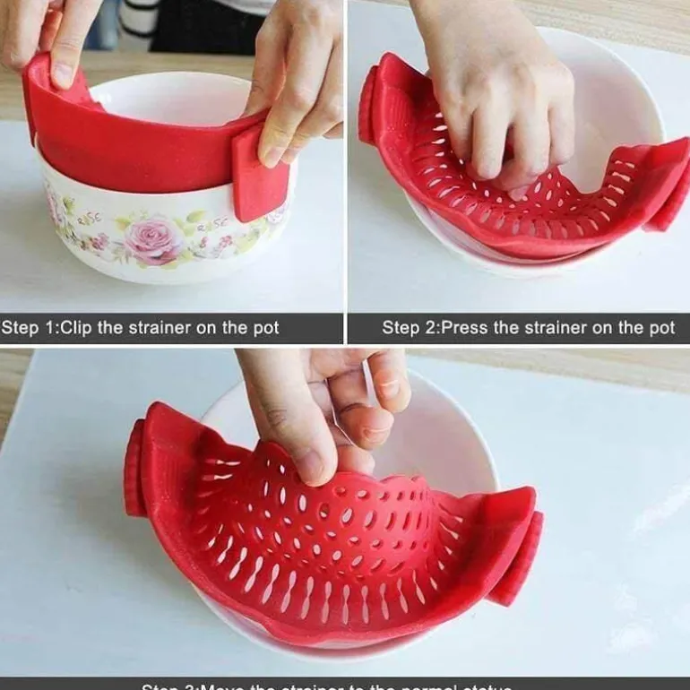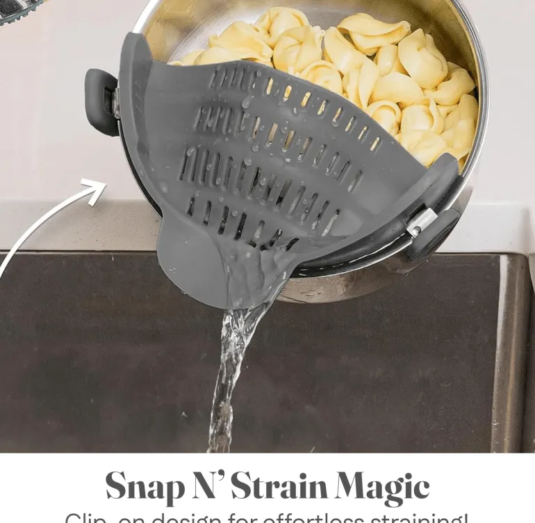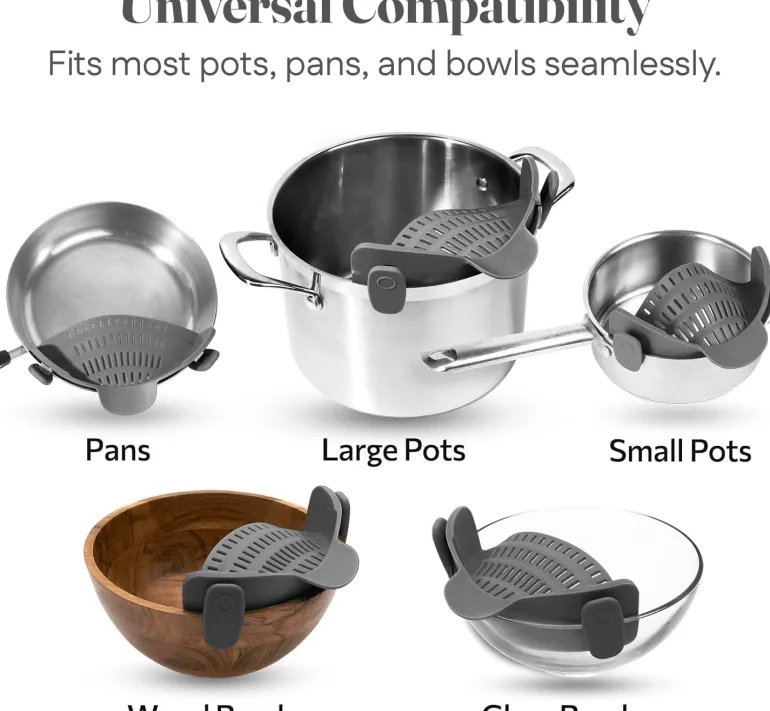 Universelle Passform: Dank des innovativen Clip-On-Designs passt dieses Sieb auf eine Vielzahl von Töpfen, Pfannen und Schüsseln. Es ist außerdem spülmaschinenfest und lässt sich mühelos reinigen. Hergestellt aus lebensmittelechtem Silikon, ist es hitzebeständig und hält Temperaturen von -32 °C bis 184 °C stand. Das antihaftbeschichtete, ungiftige Material ist geruchsneutral und sorgt für ein sicheres Kocherlebnis.