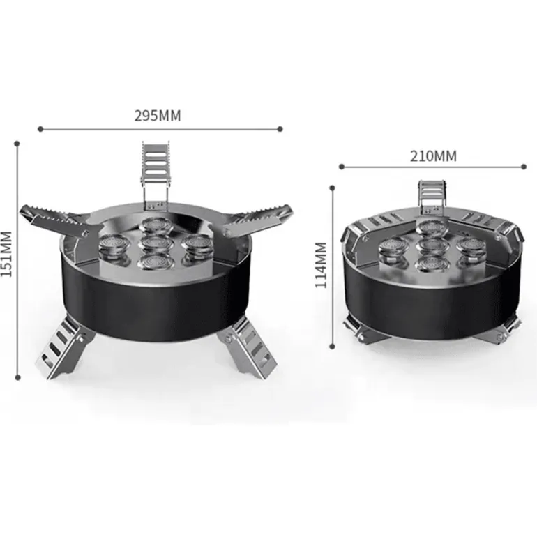 Für zusätzliche Stabilität auf unebenem Gelände verfügt der Ofen über zusammenklappbare Beine, die seine Zuverlässigkeit bei jedem Outdoor-Abenteuer erhöhen.