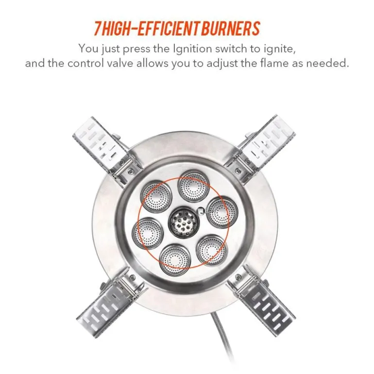 Dieser Herd mit beeindruckenden 18.000 Watt Leistung verfügt über fünf effiziente Edelstahlbrenner, die eine gleichmäßige Wärmeverteilung für gleichbleibende Kochergebnisse gewährleisten. Das einstellbare Sicherheitsventil ermöglicht eine präzise Steuerung des Gasflusses und sorgt so für sicheres Kochen. Die verstellbaren, gezackten Halterungen halten Töpfe verschiedener Größen sicher und tragen ein maximales Gewicht von 75 kg.