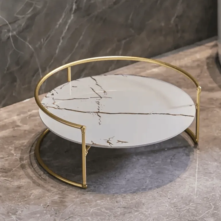 Elevate your beauty routine with the Ivalo Cosmetics Tray, a sophisticated makeup organizer designed for both functionality and style. Featuring a sleek, rounded base secured by elegant gold-finished metal frames, this tray ensures your cosmetics and essentials are beautifully displayed and easily accessible. The handcrafted marble-effect surfaces add a touch of refinement, making it a stunning addition to any vanity or countertop.