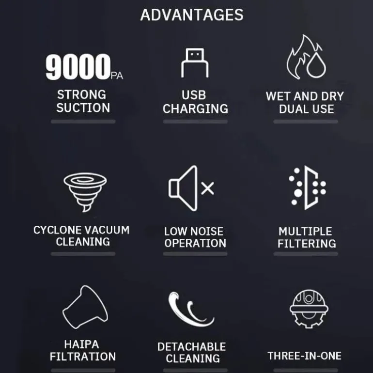Erleben Sie die Funktionalität des kabellosen Handstaubsaugers, eines vielseitigen 3-in-1-Geräts, das Ihr Zuhause und Ihr Auto makellos sauber hält. Mit seinem schlanken und ergonomischen Design in elegantem Grau bietet dieser Staubsauger eine beeindruckende Saugleistung von bis zu 9000 Pa und ist damit sowohl für Trocken- als auch für Nassreinigungsaufgaben äußerst effektiv. Dank seiner Doppelfunktionalität beseitigen Sie mühelos alltägliche Verschmutzungen, egal ob zu Hause oder unterwegs. Das robuste ABS-Material sorgt für Langlebigkeit und ein leichtes Tragegefühl.