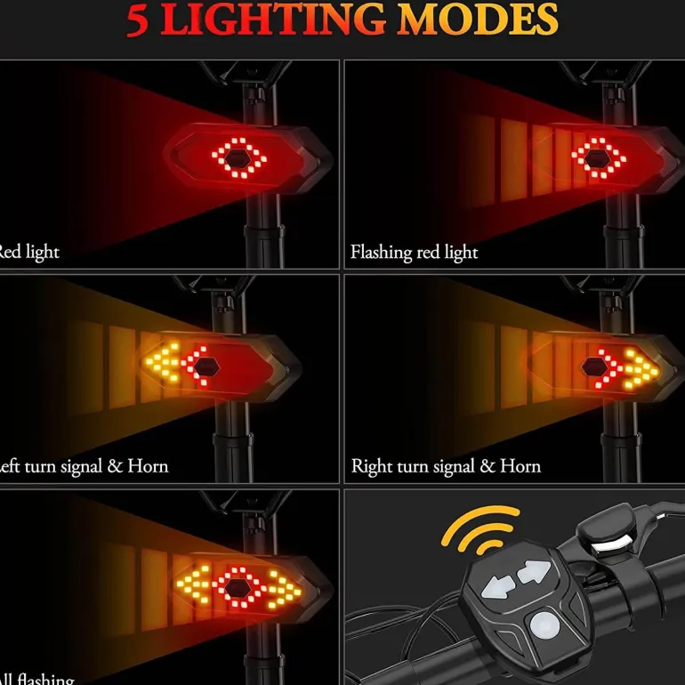 Steigern Sie Ihre Sicherheit beim Radfahren mit unserem kabellosen LED-Fahrradblinker und Sicherheitskontrollleuchte. Das sorgfältig entwickelte Rücklicht sorgt für optimale Sichtbarkeit und benutzerfreundliche Bedienung. Dieses Fahrradrücklicht verfügt über eine Fernbedienung mit drei intuitiven Tasten, mit denen Sie die Blinker in fünf verschiedenen Modi aktivieren können: Rechtsabbiegen mit lautem akustischem Alarm, Linksabbiegen mit lautem akustischem Alarm, Dauerlicht, Blinklicht und Blinken aller Lichter. Passen Sie diese Modi an Ihre Bedürfnisse und Fahrbedingungen an und machen Sie vorbeifahrende Fahrzeuge effektiv auf sich aufmerksam.