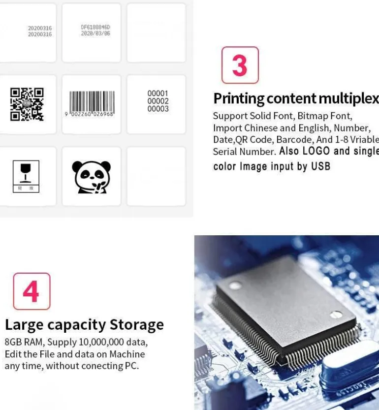 Dieser innovative tragbare Tintenstrahldrucker bietet 360°-Druckfunktionen und ermöglicht so den Druck vielfältiger Inhalte, darunter variable Seriennummern, Symbole, QR-Codes und Produktionsdetails. Er eignet sich perfekt für Materialien wie Karton, Holz, Rohre, Metall, Glas, Kunststoff und Stoff. Für optimale Ergebnisse auf gewölbten, unebenen oder rauen Oberflächen sorgen die mitgelieferten Hilfsmittel – wie beispielsweise ein Blechpositionierer.