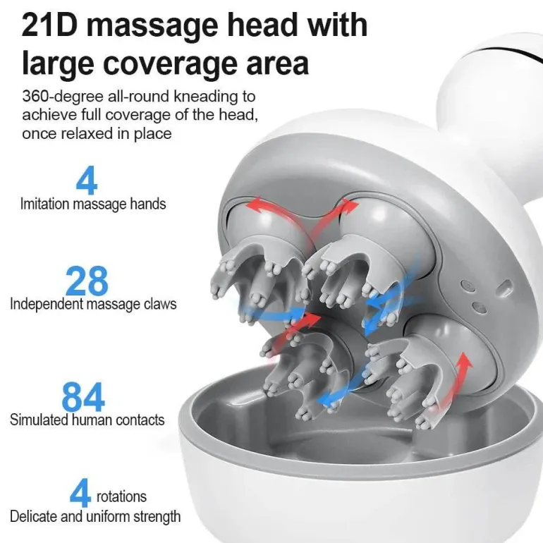 Erleben Sie die wohltuende Wirkung unseres tragbaren kabellosen Kopfhautmassagegeräts, das Stress lindert und durch sanfte Kopfmassagen Entspannung fördert. Dieses innovative Gerät verfügt über mehrere rotierende und vibrierende Massageknoten, die die Techniken einer professionellen Massage nachahmen, die Durchblutung fördern und Muskelverspannungen lösen – für ein entspannendes Erlebnis.