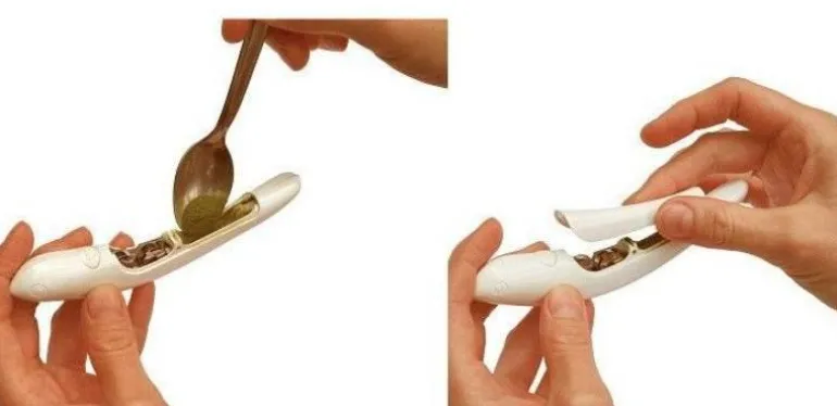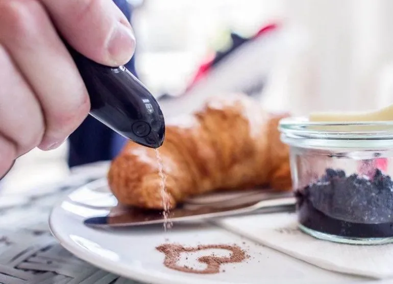 Um den Stift zu verwenden, drücken Sie leicht auf ein Ende, um den Deckel zu öffnen. Füllen Sie den Stifthalter mit dem Gewürzpulver Ihrer Wahl und schließen Sie den Deckel wieder fest. Halten Sie anschließend den kleinen Knopf am Stifthalter gedrückt, um mit dem Zeichnen zu beginnen.