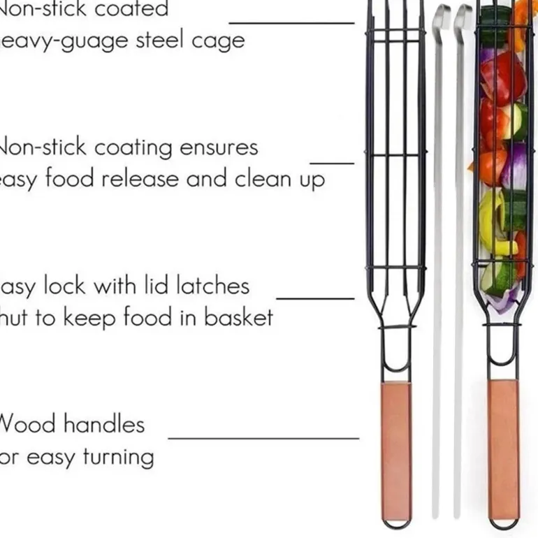 Dieses vielseitige Grillzubehör hält Ihr Grillgut beim Grillen an Ort und Stelle. Hergestellt aus lebensmittelechtem Edelstahl leitet es die Hitze effizient und sorgt für gleichmäßiges Garen. Die scharfen Enden der Spieße stechen mühelos durch verschiedene Grillgutsorten, während der praktische Ring an der Rückseite schnelles und müheloses Wenden ermöglicht. Dieser Korb eignet sich perfekt zum Aufspießen von Garnelen, Schaschlik, Hähnchen, Steak und sogar zum Rösten von Marshmallows am Feuer und macht Ihr Grillerlebnis noch besser.