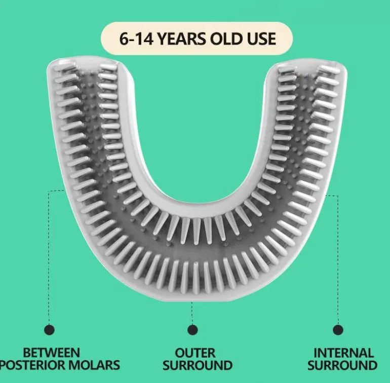 Introduce your child to a fun and engaging dental care routine with our ultrasonic silicone toothbrush, designed especially for kids. This innovative electric toothbrush turns tooth brushing from a mundane task into an enjoyable experience. It features a unique U-shaped brush tip made from soft silicone, effectively cleaning teeth, gums, and the tongue.