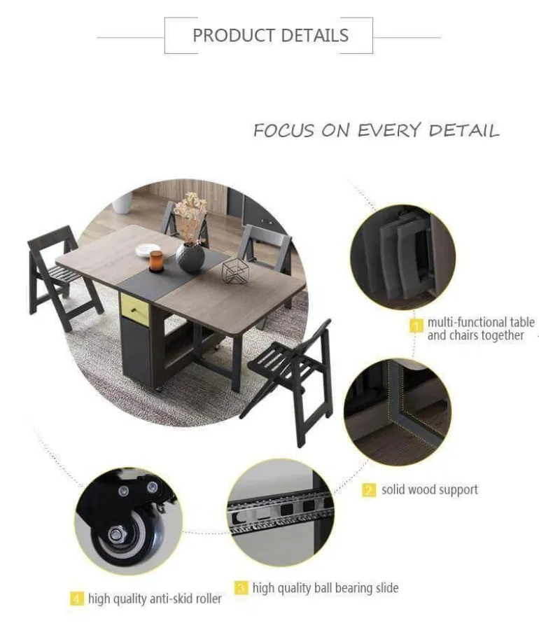 Dieses moderne Esstisch-Set aus Holz besticht durch sein schlichtes, minimalistisches Design, das den Platz optimal nutzt und sich perfekt für Wohnungen eignet, in denen jeder Quadratmeter zählt. Das klappbare Design ermöglicht eine mühelose Umgestaltung und schafft wertvollen Platz, wenn der Tisch nicht gebraucht wird.
