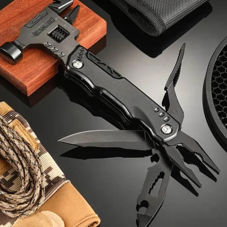 Dieses Multifunktionswerkzeug vereint mehrere wichtige Funktionen, darunter einen Minihammer, eine Zange, einen Flaschenöffner, Schraubendreher-Bits und einen Nagelzieher, und ist damit ein unschätzbarer Helfer für eine Vielzahl von Aufgaben. Zu Hause eignet es sich perfekt für Heimwerkerprojekte und Möbelreparaturen. In der Natur vereinfacht es den Zeltaufbau und das Holzhacken. Unterwegs dient es als zuverlässiges Werkzeug für Notfälle und zur Selbstrettung.